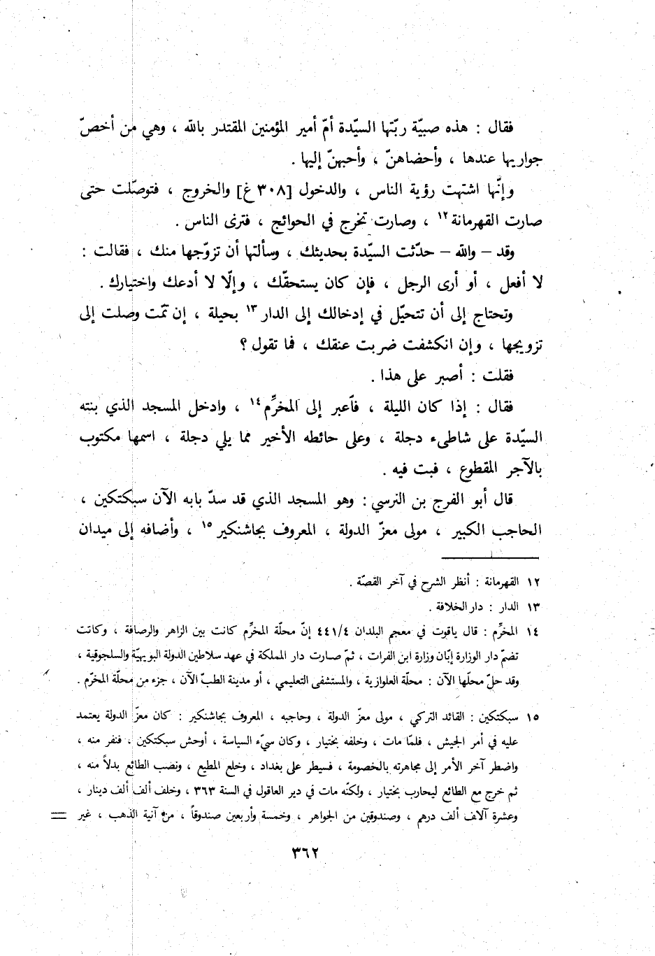 فَقَالَ: إِذا كَانَ اللَّيْلَة، فأعبر إِلَى المخرم، وادخل الْمَسْجِد الَّذِي بنته السيدة على شاطئ دجلة، وعَلى حَائِطه الْأَخير مِمَّا يَلِي دجلة، اسْمهَا مَكْتُوب بالآجر الْمَقْطُوع، فَبت فِيهِ.