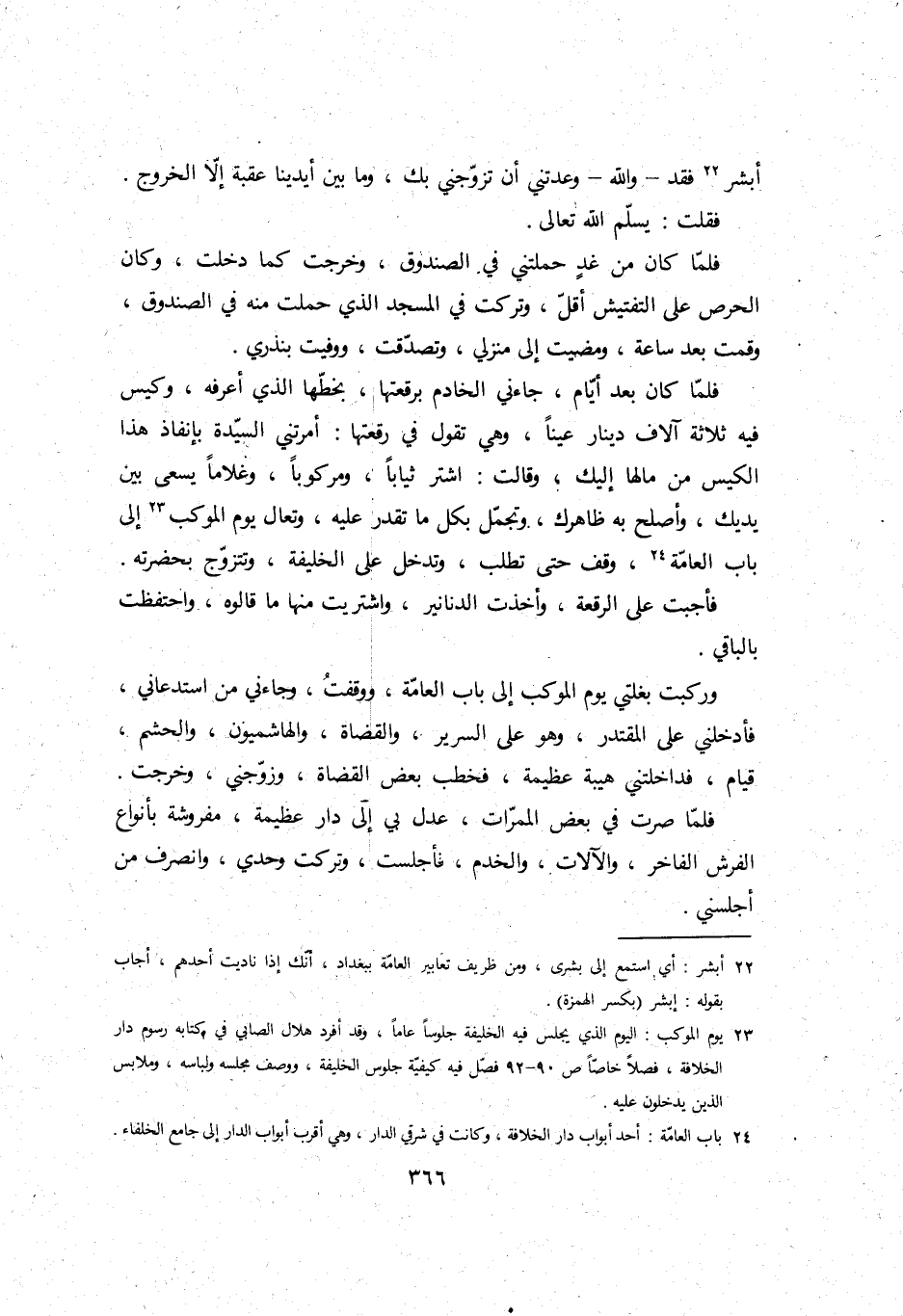 فَلَمَّا كَانَ بعد أَيَّام، جَاءَنِي الْخَادِم برقعتها، بخطها الَّذِي أعرفهُ، وكيس فِيهِ ثَلَاثَة آلَاف دِينَار عينا، وَهِي تَقول فِي رقعتها: أَمرتنِي السيدة بإنفاذ هَذَا الْكيس من مَالهَا إِلَيْك، وَقَالَت: اشْتَرِ ثيابًا، ومركوبًا، وَغُلَامًا يسْعَى بَين يَديك، وَأصْلح بِهِ ظاهرك، وتجمل بِكُل مَا تقدر عَلَيْهِ، وتعال يَوْم الموكب إِلَى بَاب الْعَامَّة، وقف حَتَّى تطلب، وَتدْخل على الْخَلِيفَة، وتتزوج بِحَضْرَتِهِ.