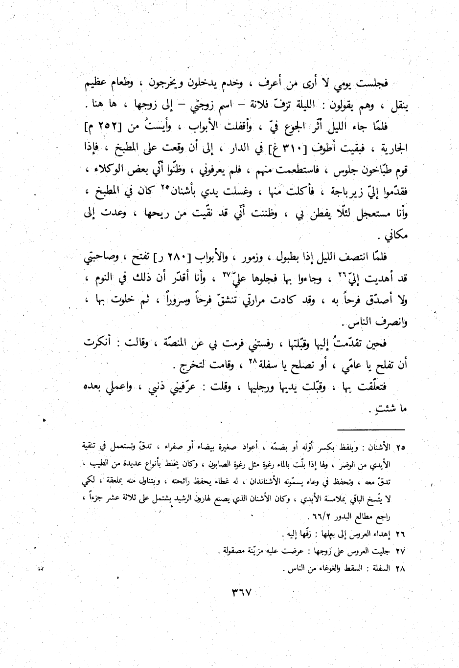 فَجَلَست يومي لَا أرى من أعرف، وخدم يدْخلُونَ وَيخرجُونَ، وَطَعَام عَظِيم ينْقل، وهم يَقُولُونَ: اللَّيْلَة تزف فُلَانَة، اسْم زَوْجَتي، إِلَى زَوجهَا، هَاهُنَا.