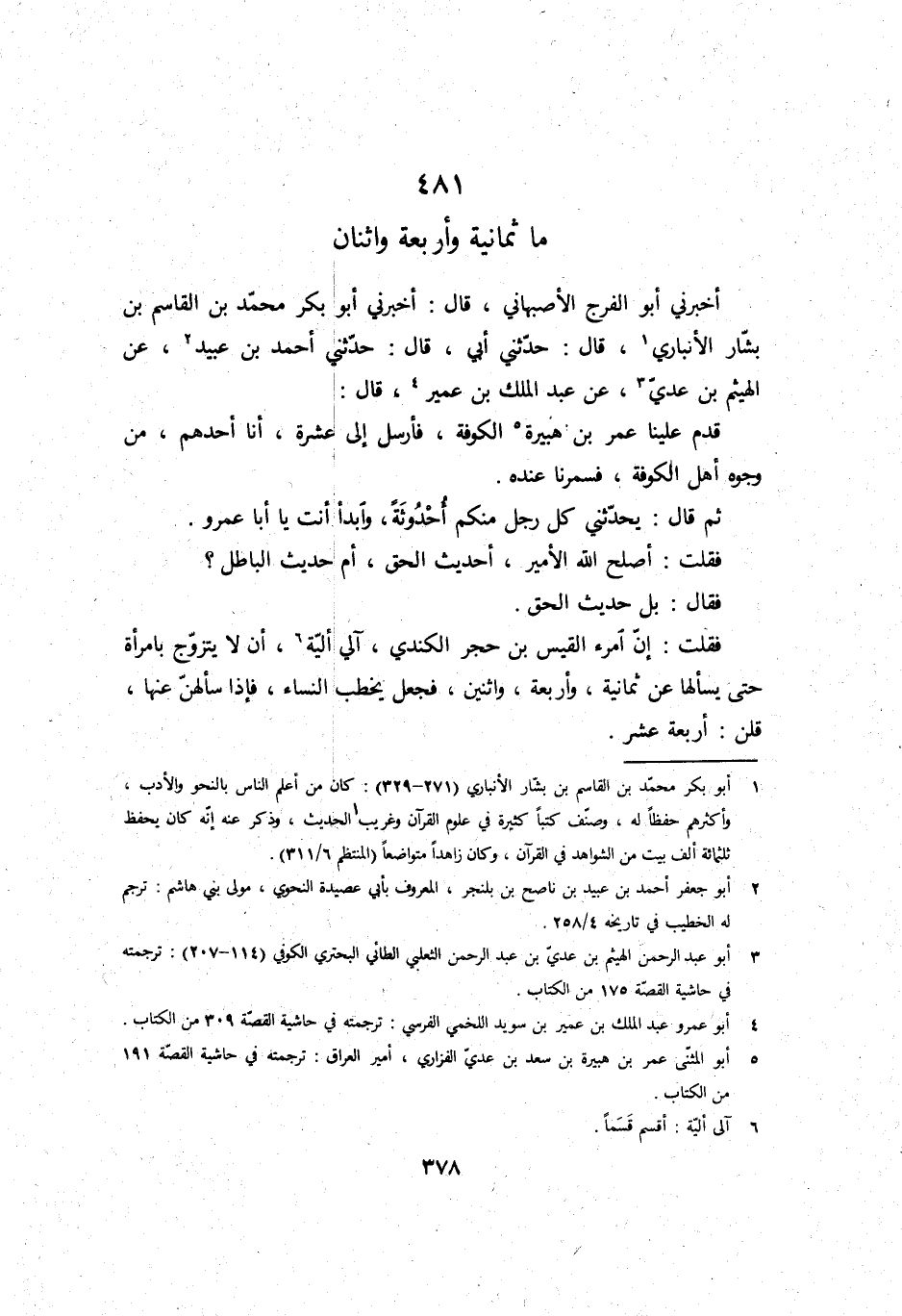 أَخْبرنِي أَبُو الْفرج الْأَصْبَهَانِيّ، قَالَ: أَخْبرنِي أَبُو بكر مُحَمَّد بن الْقَاسِم بن بشار الْأَنْبَارِي، قَالَ: حَدثنِي أبي، قَالَ: حَدثنِي أَحْمد بن عبيد، عَن الْهَيْثَم بن عدي، عَن عبد الْملك بن عُمَيْر، قَالَ: قدم علينا عمر بن هُبَيْرَة الْكُوفَة، فَأرْسل إِلَى عشرَة، أَنا أحدهم، من وُجُوه أهل الْكُوفَة، فسمرنا عِنْده.