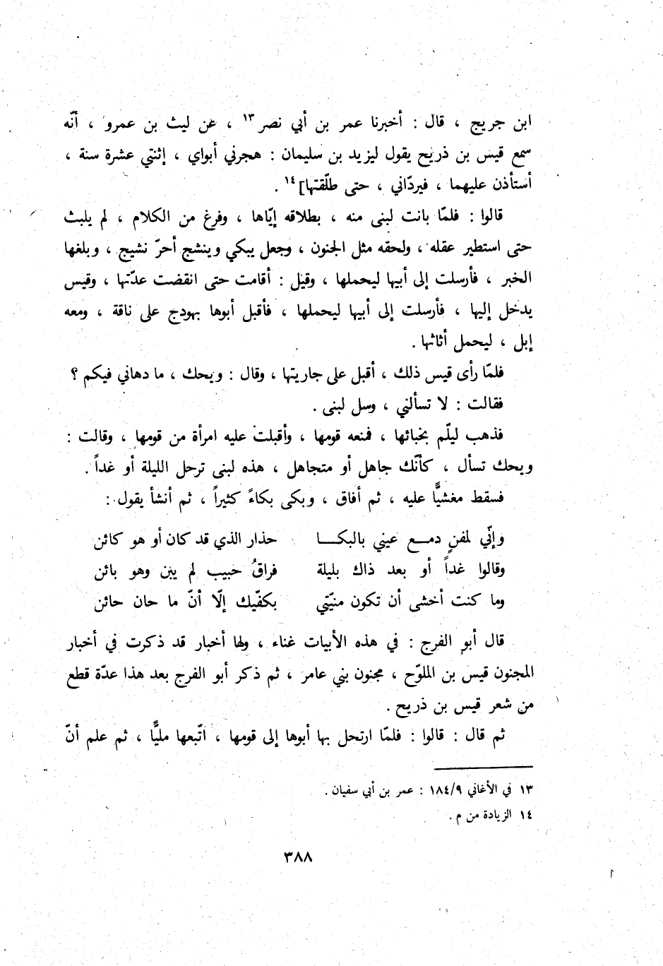 قَالَ أَبُو الْفرج: فِي هَذِه الأبيات غناء، وَلها أَخْبَار قد ذكرت فِي أَخْبَار الْمَجْنُون قيس بن الملوح، مَجْنُون بني عَامر، ثمَّ ذكر أَبُو الْفرج بعد هَذَا عدَّة قطع من شعر قيس بن ذريح.