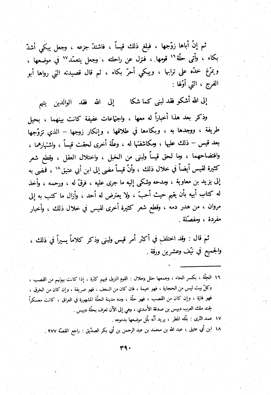 ثمَّ قَالَ: وَقد اخْتلف فِي أَكثر أَمر قيس ولبنى، وَذكر كلَاما يَسِيرا فِي ذَلِك، والجميع فِي نَيف وَعشْرين ورقة.
