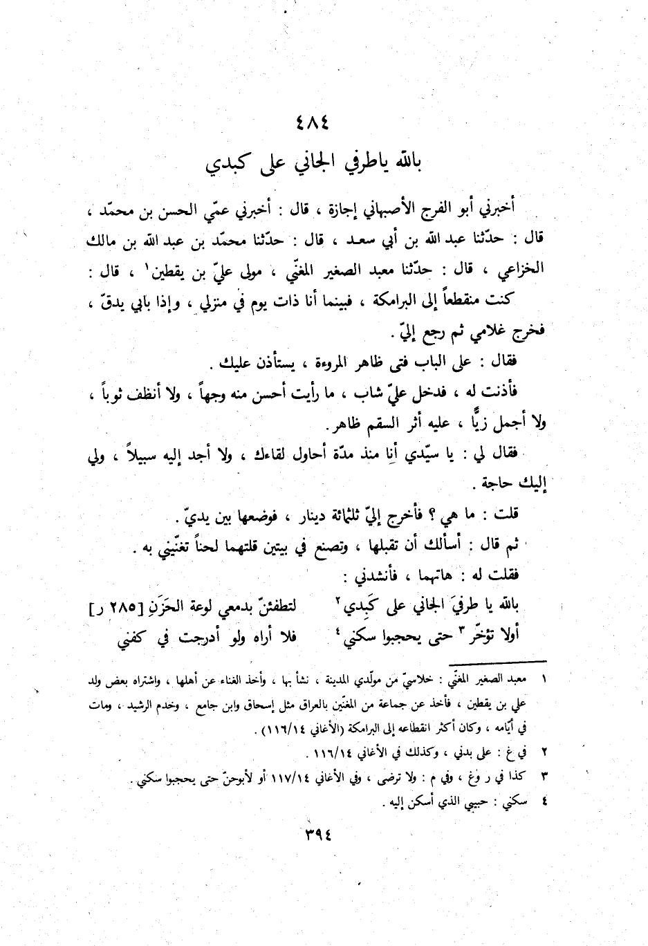 أَخْبرنِي أَبُو الْفرج الْأَصْبَهَانِيّ إجَازَة، قَالَ: أَخْبرنِي عمي الْحسن بن مُحَمَّد، قَالَ: حَدثنَا عبد الله بن أبي سعد، قَالَ: حَدثنَا مُحَمَّد بن عبد الله بن مَالك الْخُزَاعِيّ، قَالَ: حَدثنَا معبد الصَّغِير الْمُغنِي، مولى عَليّ بن يَقْطِين، قَالَ: كنت مُنْقَطِعًا إِلَى البرامكة، فَبَيْنَمَا أَنا ذَات يَوْم فِي منزلي، وَإِذا بَابي يدق، فَخرج غلامي ثمَّ رَجَعَ إِلَيّ.