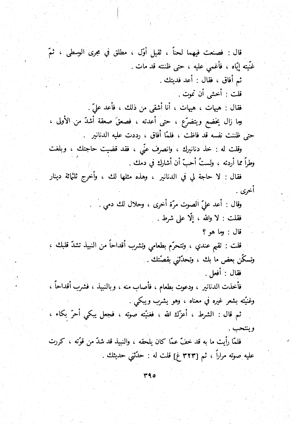 فَلَمَّا رَأَيْت مَا بِهِ قد خف عَمَّا كَانَ يلْحقهُ، والنبيذ قد شدّ من قوته، كررت عَلَيْهِ صَوته مرَارًا، ثمَّ قلت لَهُ: حَدثنِي حَدِيثك.
