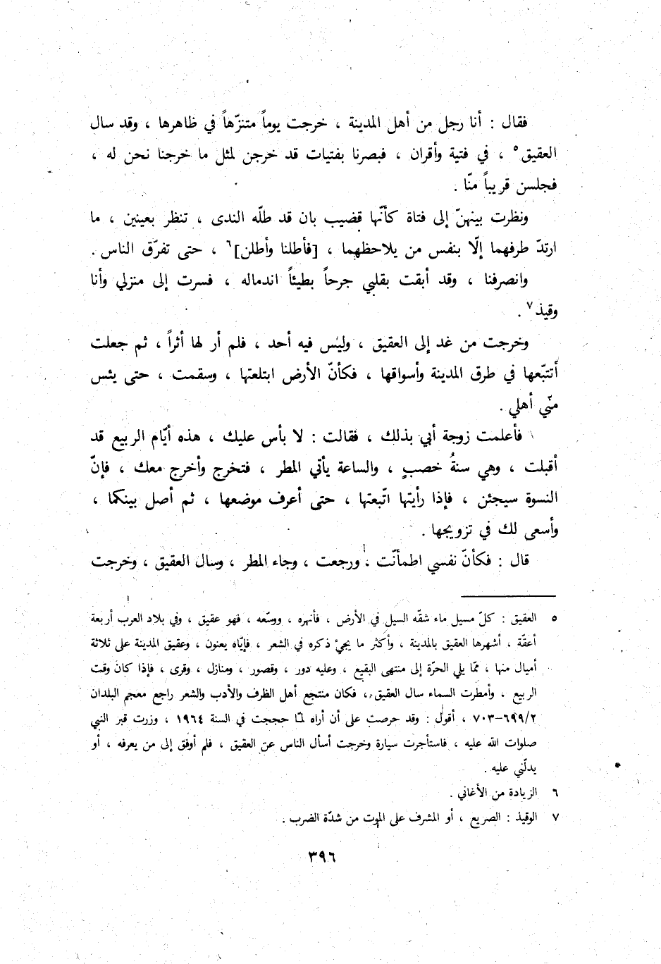 فَقَالَ: أَنا رجل من أهل الْمَدِينَة، خرجت يَوْمًا متنزهًا فِي ظَاهرهَا، وَقد سَالَ العقيق، فِي فتية وأقران، فبصرنا بفتيات قد خرجن لمثل مَا خرجنَا نَحن لَهُ، فجلسن قَرِيبا منا.