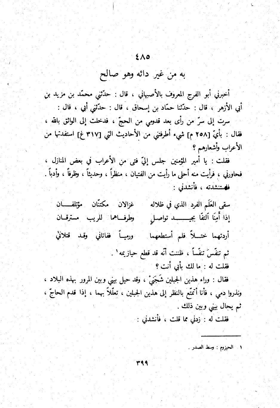 أَخْبرنِي أَبُو الْفرج الْمَعْرُوف بالأصبهاني، قَالَ: حَدثنِي مُحَمَّد بن مزِيد بن أبي الْأَزْهَر، قَالَ: حَدثنَا حَمَّاد بن إِسْحَاق، قَالَ: حَدثنِي أبي، قَالَ: سرت إِلَى سر من رأى بعد قدومي من الْحَج، فَدخلت إِلَى الواثق بِاللَّه، فَقَالَ: بِأَيّ شَيْء أطرفتني من الْأَحَادِيث الَّتِي استفدتها من الْأَعْرَاب وأشعارهم؟ فَقلت: يَا أَمِير الْمُؤمنِينَ جلس إِلَيّ فَتى من الْأَعْرَاب فِي بعض الْمنَازل، فحاورني، فَرَأَيْت مِنْهُ أحلى مَا رَأَيْت من الفتيان، منْظرًا، وحديثًا، وظرفًا، وأدبًا.