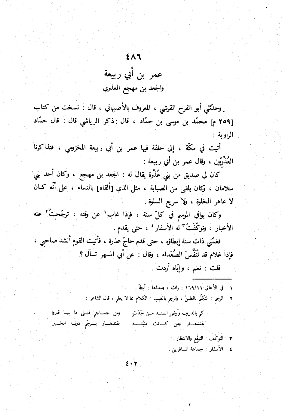 وحَدثني أَبُو الْفرج الْقرشِي، الْمَعْرُوف بالأصبهاني، قَالَ: نسخت من كتاب مُحَمَّد بن مُوسَى بن حَمَّاد، قَالَ: ذكر الرياشي قَالَ: قَالَ حَمَّاد الراوية: أتيت فِي مَكَّة، إِلَى حَلقَة فِيهَا عمر بن أبي ربيعَة المَخْزُومِي، فتذاكرنا العذريين، وَقَالَ عمر بن أبي ربيعَة: كَانَ لي صديق من بني عذرة يُقَال لَهُ: الْجَعْد بن مهجع، وَكَانَ أحد بني سلامان، وَكَانَ يلقى من الصبابة، مثل الَّذِي أَلْقَاهُ بِالنسَاء، على أَنه كَانَ لَا عاهر الْخلْوَة، وَلَا سريع السلوة.