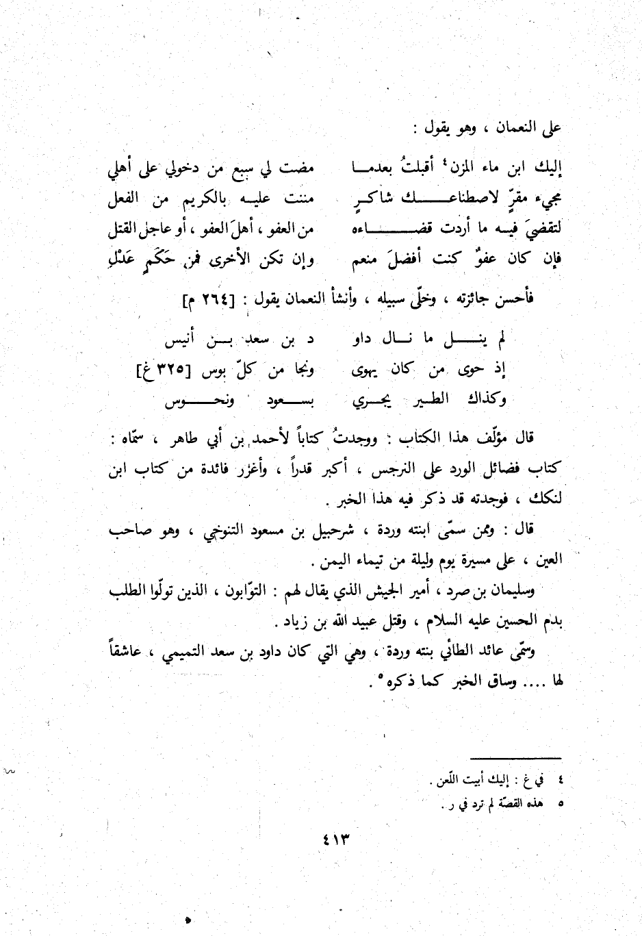 قَالَ مؤلف هَذَا الْكتاب: وَوجدت كتابا لِأَحْمَد بن أبي طَاهِر، سَمَّاهُ: كتاب فَضَائِل الْورْد على النرجس، أكبر قدرا، وأغزر فَائِدَة من كتاب ابْن لنكك، فَوَجَدته قد ذكر فِيهِ هَذَا الْخَبَر.