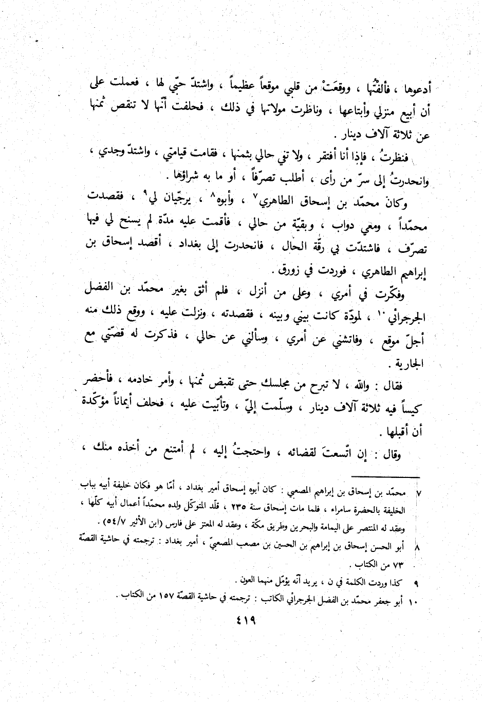فَنَظَرت، فَإِذا أَنا أفتقر، وَلَا تفي حَالي بِثمنِهَا، فَقَامَتْ قيامتي، وَاشْتَدَّ وجدي، وانحدرت إِلَى سر من رأى، أطلب تَصرفا، أَو مَا بِهِ شراؤها.