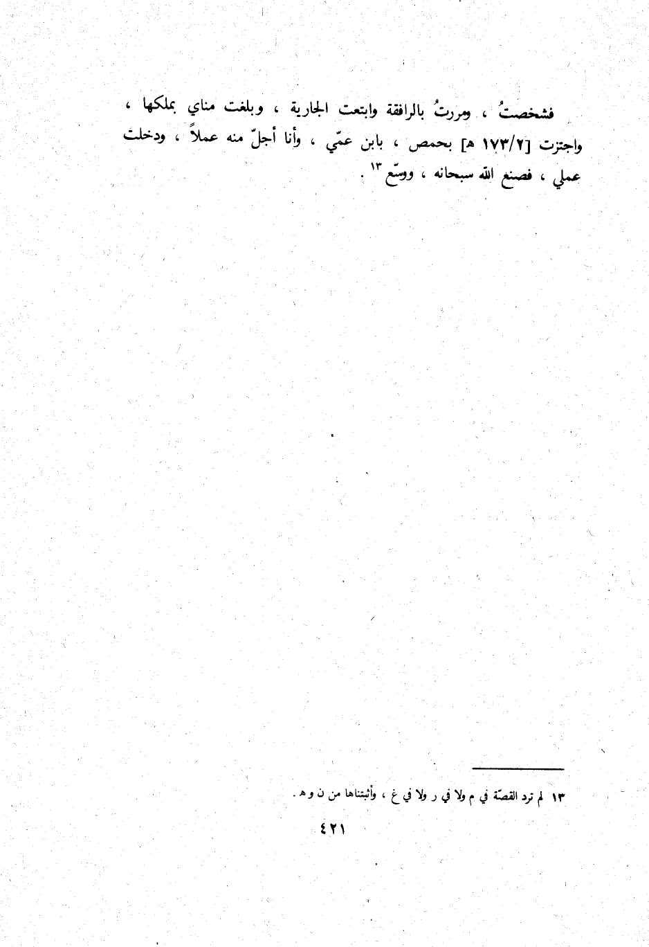 فشخصت، ومررت بالرافقة وابتعت الْجَارِيَة، وَبَلغت مناي بملكها، واجتزت بحمص، بِابْن عمي، وَأَنا أجل مِنْهُ عملا، وَدخلت عَمَلي، فَصنعَ الله سُبْحَانَهُ، ووسع.