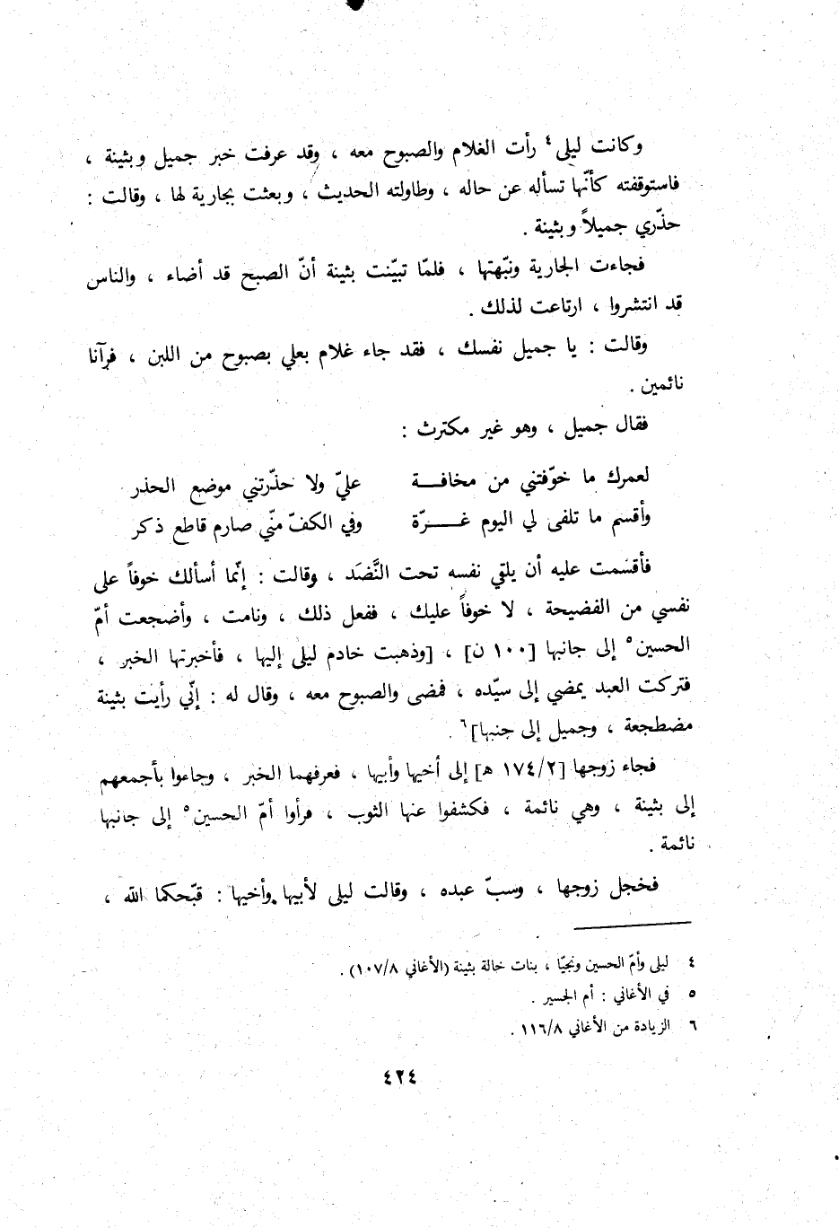 فأقسمت عَلَيْهِ أَن يلقِي نَفسه تَحت النضد، وَقَالَت: إِنَّمَا أَسأَلك خوفًا على نَفسِي من الفضيحة، لَا خوفًا عَلَيْك، فَفعل ذَلِك، ونامت، وأضجعت أم الْحُسَيْن إِلَى جَانبهَا، وَذَهَبت خَادِم ليلى إِلَيْهَا، فَأَخْبَرتهَا الْخَبَر، فَتركت العَبْد يمْضِي إِلَى سَيّده، فَمضى والصبوح مَعَه، وَقَالَ لَهُ: إِنِّي رَأَيْت بثينة مُضْطَجِعَة، وَجَمِيل إِلَى جنبها.