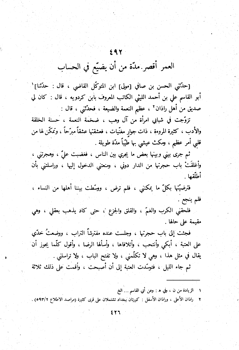 حَدثنِي الْحسن بن صافي مولى ابْن المتَوَكل القَاضِي، قَالَ: حَدثنَا أَبُو الْقَاسِم عَليّ بن أَحْمد اللَّيْثِيّ الْكَاتِب الْمَعْرُوف بِابْن كردويه، قَالَ: كَانَ لي صديق من أهل راذان، عَظِيم النِّعْمَة والضيعة، فَحَدثني، قَالَ: تزوجت فِي شَبَابِي امْرَأَة من آل وهب، ضخمة النِّعْمَة، حَسَنَة الْخلقَة وَالْأَدب، كَثِيرَة الْمُرُوءَة، ذَات جوَار مغنيات، فعشقتها عشقًا مبرحًا، وَتمكن لَهَا من قلبِي أَمر عَظِيم، وَمكث عيشي بهَا طيبا مُدَّة طَوِيلَة.