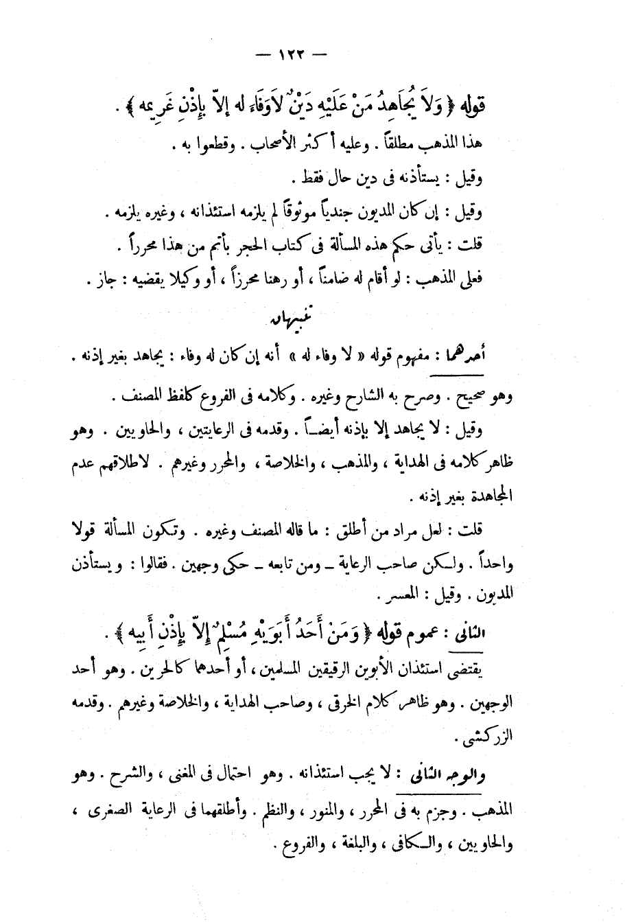 أَحَدُهُمَا: مَفْهُومُ قَوْلِهِ " لَا وَفَاءَ لَهُ " أَنَّهُ إنْ كَانَ لَهُ وَفَاءٌ: يُجَاهِدُ بِغَيْرِ إذْنِهِ. وَهُوَ صَحِيحٌ. وَصَرَّحَ بِهِ الشَّارِحُ وَغَيْرُهُ. وَكَلَامُهُ فِي الْفُرُوعِ كَلَفْظِ الْمُصَنِّفِ. وَقِيلَ: لَا يُجَاهِدُ إلَّا بِإِذْنِهِ أَيْضًا. وَقَدَّمَهُ فِي الرِّعَايَتَيْنِ، وَالْحَاوِيَيْنِ. وَهُوَ ظَاهِرُهُ كَلَامِهِ فِي الْهِدَايَةِ، وَالْمُذْهَبِ، وَالْخُلَاصَةِ، وَالْمُحَرَّرِ وَغَيْرِهِمْ. لِإِطْلَاقِهِمْ عَدَمَ الْمُجَاهَدَةِ بِغَيْرِ إذْنِهِ. قُلْت: لَعَلَّ مُرَادَ مَنْ أَطْلَقَ: مَا قَالَهُ الْمُصَنِّفُ وَغَيْرُهُ. وَتَكُونُ الْمَسْأَلَةُ قَوْلًا وَاحِدًا. وَلَكِنَّ صَاحِبَ الرِّعَايَةِ وَمَنْ تَابَعَهُ حَكَى وَجْهَيْنِ. فَقَالُوا: وَيَسْتَأْذِنُ الْمَدْيُونُ. وَقِيلَ: الْمُعْسِرُ.