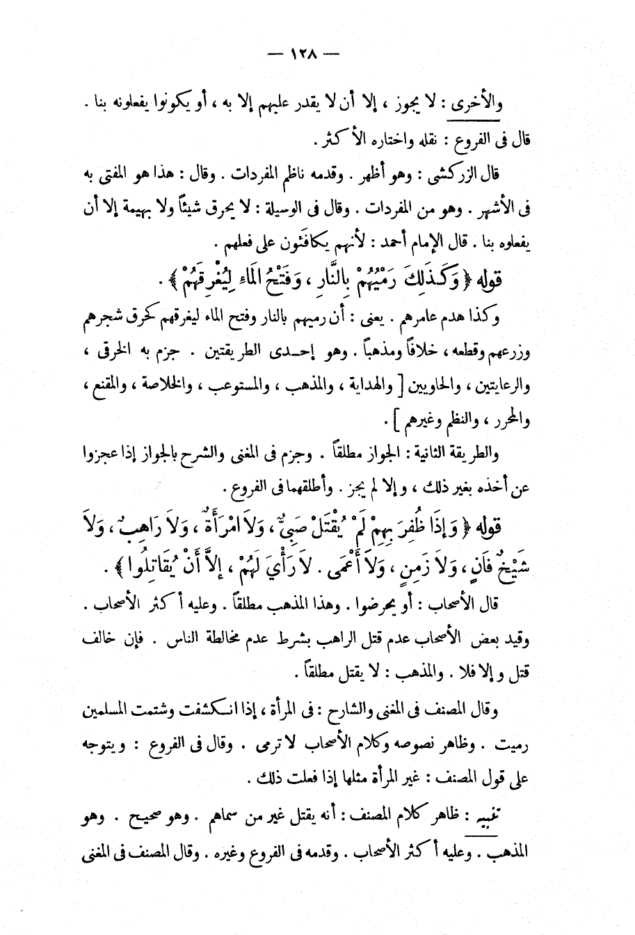وَالْأُخْرَى: لَا يَجُوزُ، إلَّا أَنْ لَا يَقْدِرَ عَلَيْهِمْ إلَّا بِهِ، أَوْ يَكُونُوا يَفْعَلُونَهُ بِنَا. قَالَ فِي الْفُرُوعِ: نَقَلَهُ وَاخْتَارَهُ الْأَكْثَرُ. قَالَ الزَّرْكَشِيُّ: وَهُوَ أَظْهَرُ. وَقَدَّمَهُ نَاظِمُ الْمُفْرَدَاتِ. وَقَالَ: هَذَا هُوَ الْمُفْتَى بِهِ فِي الْأَشْهَرِ. وَهُوَ مِنْ الْمُفْرَدَاتِ. وَقَالَ فِي الْوَسِيلَةِ: لَا يَحْرُقُ شَيْئًا وَلَا بَهِيمَةً إلَّا أَنْ يَفْعَلُوهُ بِنَا. قَالَ الْإِمَامُ أَحْمَدُ: لِأَنَّهُمْ يُكَافَئُونَ عَلَى فِعْلِهِمْ.