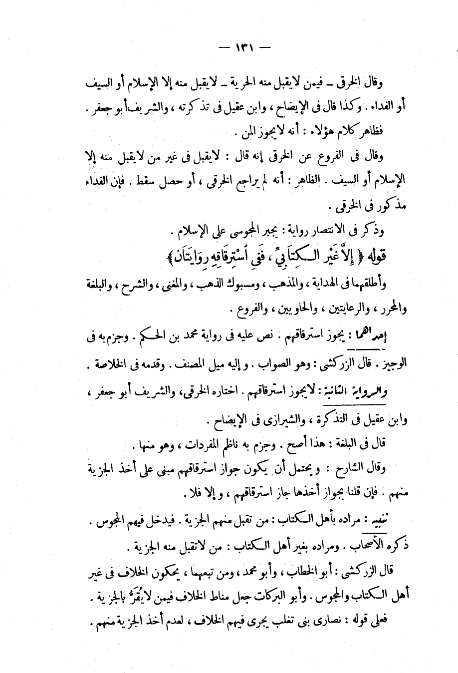 مُرَادُهُ بِأَهْلِ الْكِتَابِ: مَنْ تُقْبَلُ مِنْهُمْ الْجِزْيَةُ. فَيَدْخُلُ فِيهِمْ الْمَجُوسُ. ذَكَرَهُ الْأَصْحَابُ. وَمُرَادُهُ بِغَيْرِ أَهْلِ الْكِتَابِ: مَنْ لَا تُقْبَلُ مِنْهُ الْجِزْيَةُ. قَالَ الزَّرْكَشِيُّ: أَبُو الْخَطَّابِ، وَأَبُو مُحَمَّدٍ وَمَنْ تَبِعَهُمَا، يَحْكُونَ الْخِلَافَ فِي غَيْرِ أَهْلِ الْكِتَابِ وَالْمَجُوس. وَأَبُو الْبَرَكَاتِ جَعَلَ مَنَاطَ الْخِلَافِ فِيمَنْ لَا يُقِرُّ بِالْجِزْيَةِ. فَعَلَى قَوْلِهِ: نَصَارَى بَنِي تَغْلِبَ يَجْرِي فِيهِمْ الْخِلَافُ، لِعَدَمِ أَخْذِ الْجِزْيَةِ مِنْهُمْ.