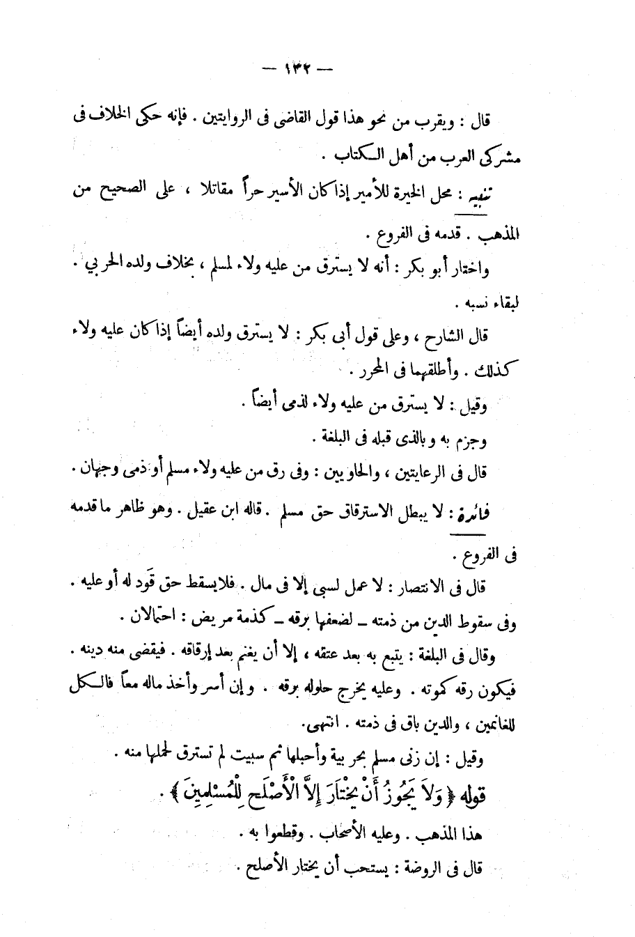 مَحَلُّ الْخِيرَةِ لِلْأَمِيرِ إذَا كَانَ الْأَسِيرُ حُرًّا مُقَاتِلًا، عَلَى الصَّحِيحِ مِنْ الْمَذْهَبِ. قَدَّمَهُ فِي الْفُرُوعِ. وَاخْتَارَ أَبُو بَكْرٍ: أَنَّهُ لَا يُسْتَرَقُّ مَنْ عَلَيْهِ وَلَاءٌ لِمُسْلِمٍ، بِخِلَافِ وَلَدِهِ الْحَرْبِيِّ. لِبَقَاءِ نَسَبِهِ. قَالَ الشَّارِحُ، وَعَلَى قَوْلِ أَبِي بَكْرٍ: لَا يُسْتَرَقُّ وَلَدُهُ أَيْضًا إذَا كَانَ عَلَيْهِ وَلَاءٌ كَذَلِكَ. وَأَطْلَقَهُمَا فِي الْمُحَرَّرِ. وَقِيلَ: لَا يُسْتَرَقُّ مَنْ عَلَيْهِ وَلَاءٌ لِذِمِّيٍّ أَيْضًا. وَجَزَمَ بِهِ وَبِاَلَّذِي قَبْلَهُ فِي الْبُلْغَةِ قَالَ فِي الرِّعَايَتَيْنِ، وَالْحَاوِيَيْنِ: وَفِي رِقِّ مَنْ عَلَيْهِ وَلَاءُ مُسْلِمٍ أَوْ ذِمِّيٍّ وَجْهَانِ.