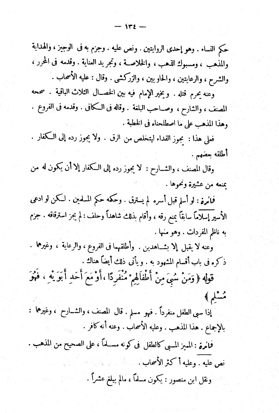 حُكْمَ النِّسَاءِ. وَهُوَ إحْدَى الرِّوَايَتَيْنِ. وَنَصَّ عَلَيْهِ. وَجَزَمَ بِهِ فِي الْوَجِيزِ، وَالْهِدَايَةِ وَالْمُذْهَبِ، وَمَسْبُوكِ الذَّهَبِ، وَالْخُلَاصَةِ، وَتَجْرِيدِ الْعِنَايَةِ. وَقَدَّمَهُ فِي الْمُحَرَّرِ، وَالشَّرْحِ، وَالرِّعَايَتَيْنِ، وَالْحَاوِيَيْنِ، وَالزَّرْكَشِيِّ. وَقَالَ: عَلَيْهِ الْأَصْحَابُ. وَعَنْهُ يَحْرُمُ قَتْلُهُ. وَيُخَيَّرُ الْإِمَامُ فِيهِ بَيْنَ الْخِصَالِ الثَّلَاثِ الْبَاقِيَةِ. صَحَّحَهُ الْمُصَنِّفُ، وَالشَّارِحُ، وَصَاحِبُ الْبُلْغَةِ. وَقَالَهُ فِي الْكَافِي. وَقَدَّمَهُ فِي الْفُرُوعِ. وَهَذَا الْمَذْهَبُ عَلَى مَا أَصْطَلَحْنَاهُ فِي الْخُطْبَةِ. فَعَلَى هَذَا: يَجُوزُ الْفِدَاءُ لِيَتَخَلَّصَ مِنْ الرِّقِّ. وَلَا يَجُوزُ رَدُّهُ إلَى الْكُفَّارِ. أَطْلَقَهُ بَعْضُهُمْ. وَقَالَ الْمُصَنِّفُ، وَالشَّارِحُ: لَا يَجُوزُ رَدُّهُ إلَى الْكُفَّارِ إلَّا أَنْ يَكُونَ لَهُ مَنْ يَمْنَعُهُ مِنْ عَشِيرَةٍ وَنَحْوِهَا.