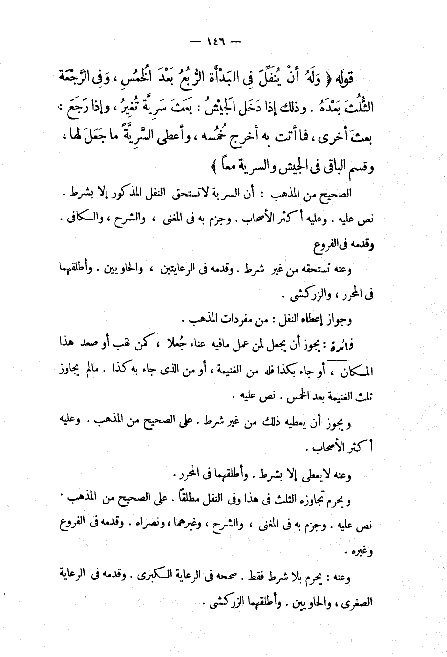 قَوْلُهُ (وَلَهُ أَنْ يُنَفِّلَ فِي الْبَدْأَةِ الرُّبُعَ بَعْدَ الْخُمُسِ، وَفِي الرَّجْعَةِ الثُّلُثَ بَعْدَهُ. وَذَلِكَ إذَا دَخَلَ الْجَيْشُ: بَعَثَ سَرِيَّةً تُغِيرُ، وَإِذَا رَجَعَ: بَعَثَ أُخْرَى، فَمَا أَتَتْ بِهِ أَخْرَجَ خُمُسَهُ، وَأَعْطَى السَّرِيَّةَ مَا جُعِلَ لَهَا، وَقَسَمَ الْبَاقِيَ فِي الْجَيْشِ وَالسَّرِيَّةِ مَعًا) الصَّحِيحُ مِنْ الْمَذْهَبِ: أَنَّ السَّرِيَّةَ لَا تَسْتَحِقُّ النَّفَلَ الْمَذْكُورَ إلَّا بِشَرْطٍ. نَصَّ عَلَيْهِ. وَعَلَيْهِ أَكْثَرُ الْأَصْحَابِ. وَجَزَمَ بِهِ فِي الْمُغْنِي، وَالشَّرْحِ، وَالْكَافِي. وَقَدَّمَهُ فِي الْفُرُوعِ وَعَنْهُ تَسْتَحِقُّهُ مِنْ غَيْرِ شَرْطٍ. وَقَدَّمَهُ فِي الرِّعَايَتَيْنِ، وَالْحَاوِيَيْنِ. وَأَطْلَقَهُمَا فِي الْمُحَرَّرِ، وَالزَّرْكَشِيِّ. وَجَوَازُ إعْطَاءِ النَّفْلِ: مِنْ مُفْرَدَاتِ الْمَذْهَبِ.