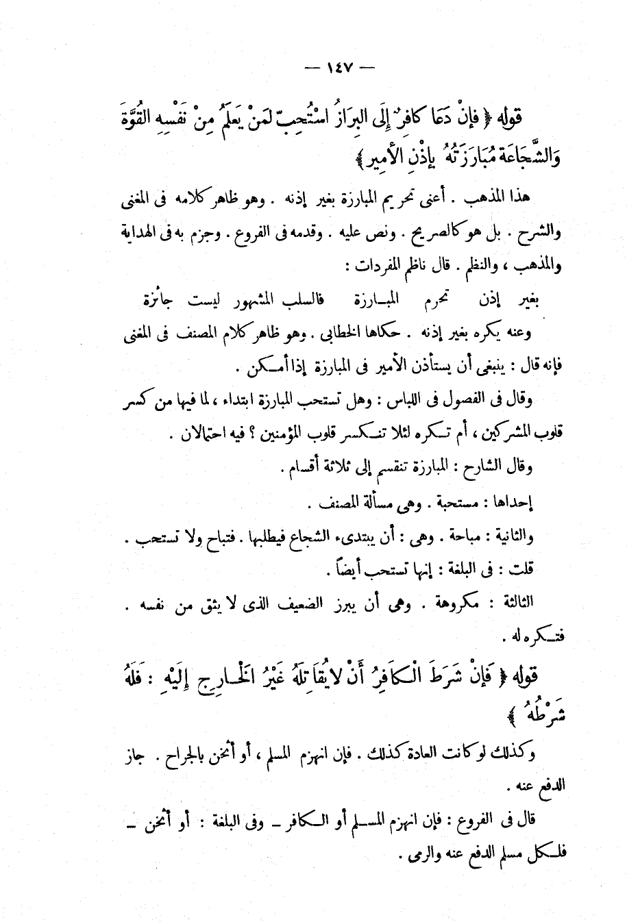 قَوْلُهُ (فَإِنْ دَعَا كَافِرٌ إلَى الْبِرَازِ اُسْتُحِبَّ لِمَنْ يَعْلَمُ مِنْ نَفْسِهِ الْقُوَّةَ وَالشُّجَاعَةَ مُبَارَزَتُهُ بِإِذْنِ الْأَمِيرِ) هَذَا الْمَذْهَبُ. أَعْنِي تَحْرِيمَ الْمُبَارَزَةِ بِغَيْرِ إذْنِهِ. وَهُوَ ظَاهِرُ كَلَامِهِ فِي الْمُغْنِي وَالشَّرْحِ. بَلْ هُوَ كَالصَّرِيحِ. وَنَصَّ عَلَيْهِ. وَقَدَّمَهُ فِي الْفُرُوعِ. وَجَزَمَ بِهِ فِي الْهِدَايَةِ وَالْمُذْهَبِ، وَالنَّظْمِ. قَالَ نَاظِمُ الْمُفْرَدَاتِ: بِغَيْرِ إذْنٍ تَحْرُمُ الْمُبَارَزَةُ فَالسَّلْبُ الْمَشْهُورُ لَيْسَتْ جَائِزَةً وَعَنْهُ يُكْرَهُ بِغَيْرِ إذْنِهِ. حَكَاهَا الْخَطَّابِيُّ. وَهُوَ ظَاهِرُ كَلَامِ الْمُصَنِّفِ فِي الْمُغْنِي فَإِنَّهُ قَالَ: يَنْبَغِي أَنْ يَسْتَأْذِنَ الْأَمِيرَ فِي الْمُبَارَزَةِ إذَا أَمْكَنَ. وَقَالَ فِي الْفُصُولِ فِي اللِّبَاسِ: وَهَلْ تُسْتَحَبُّ الْمُبَارَزَةُ ابْتِدَاءً، لِمَا فِيهَا مِنْ كَسْرِ قُلُوبِ الْمُشْرِكِينَ، أَمْ تُكْرَهُ لِئَلَّا تَنْكَسِرَ قُلُوبُ الْمُؤْمِنِينَ؟ فِيهِ احْتِمَالَانِ. وَقَالَ الشَّارِحُ: الْمُبَارَزَةُ تَنْقَسِمُ إلَى ثَلَاثَةِ أَقْسَامٍ.