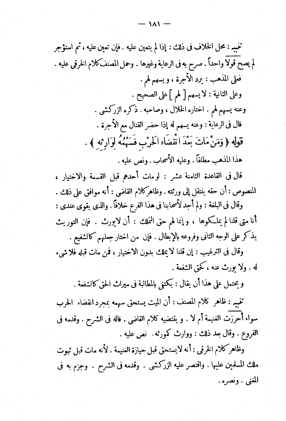 وَظَاهِرُ كَلَامِ الْخِرَقِيِّ: أَنَّهُ لَا يَسْتَحِقُّ قَبْلَ حِيَازَةِ الْغَنِيمَةِ. لِأَنَّهُ مَاتَ قَبْلَ ثُبُوتِ مِلْكِ الْمُسْلِمِينَ عَلَيْهَا. وَاقْتَصَرَ عَلَيْهِ الزَّرْكَشِيُّ. وَقَدَّمَهُ فِي الشَّرْحِ. وَجَزَمَ بِهِ فِي الْمُغْنِي. وَنَصَرَهُ.