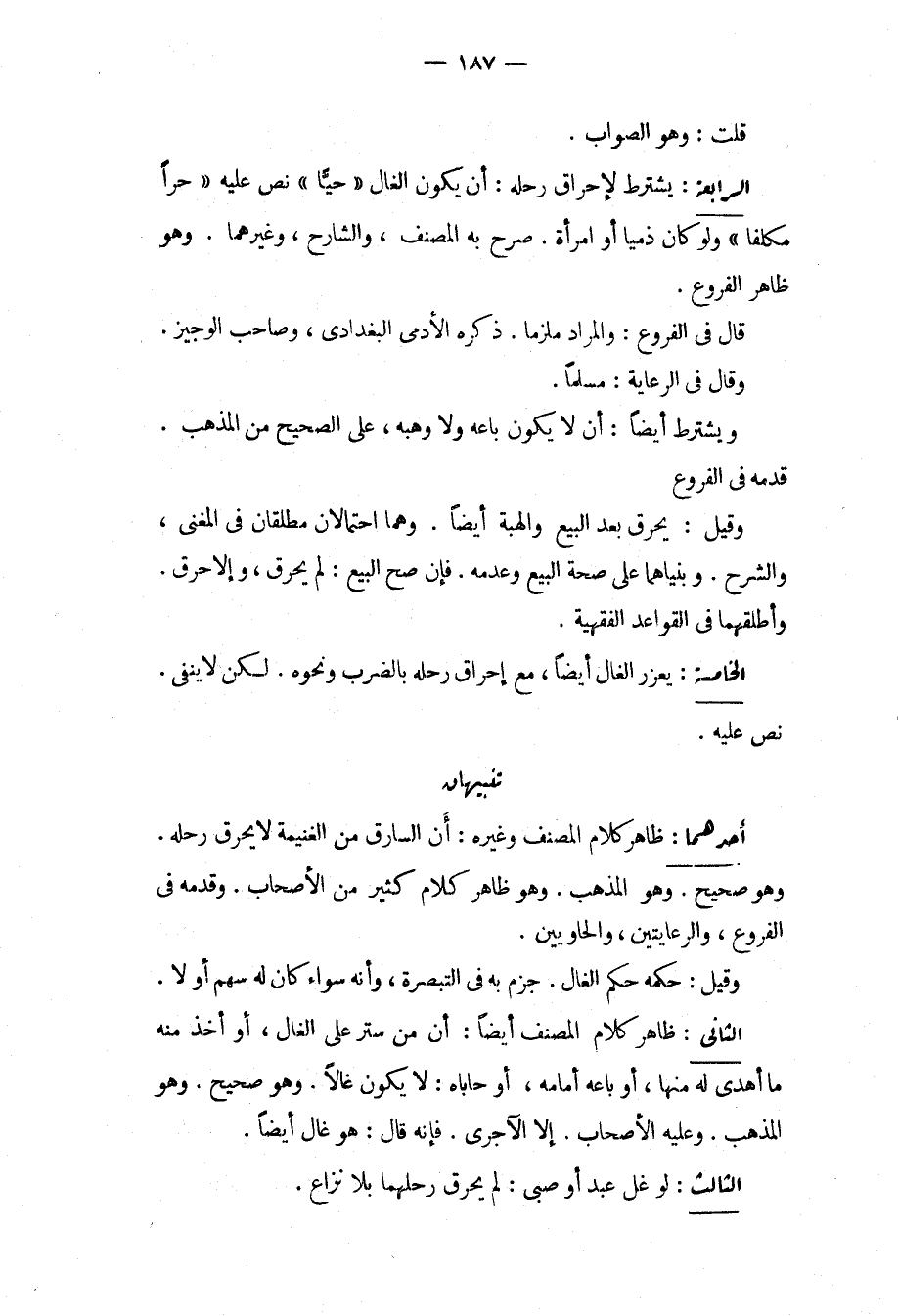 الرَّابِعَةُ: يُشْتَرَطُ لِإِحْرَاقِ رَحْلِهِ: أَنْ يَكُونَ الْغَالُّ " حَيًّا " نَصَّ عَلَيْهِ " حُرًّا مُكَلَّفًا " وَلَوْ كَانَ ذِمِّيًّا أَوْ امْرَأَةً. صَرَّحَ بِهِ الْمُصَنِّفُ، وَالشَّارِحُ، وَغَيْرُهُمَا. وَهُوَ ظَاهِرُ الْفُرُوعِ.