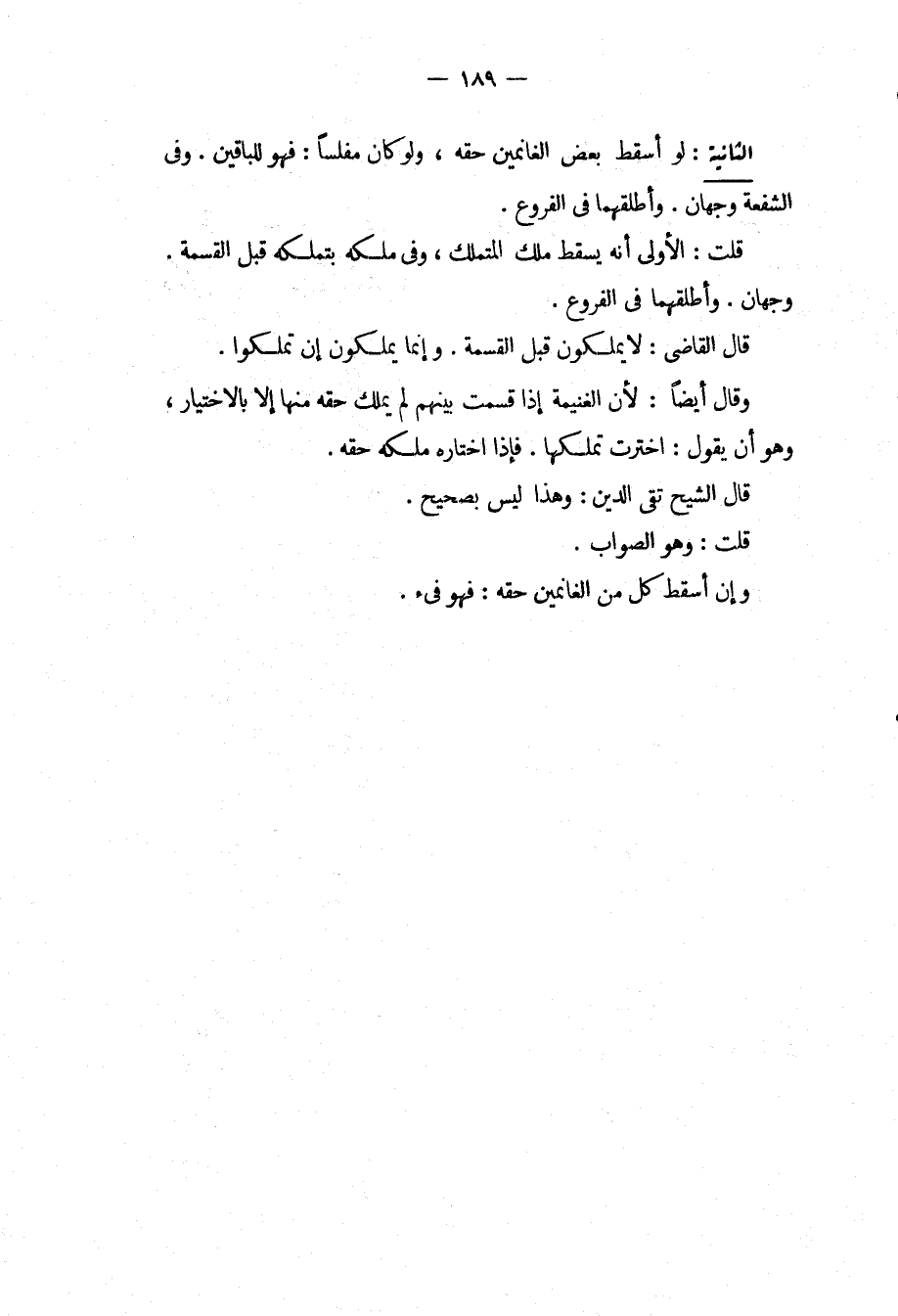الثَّانِيَةُ: لَوْ أَسْقَطَ بَعْضُ الْغَانِمِينَ حَقَّهُ، وَلَوْ كَانَ مُفْلِسًا: فَهُوَ لِلْبَاقِينَ. وَفِي الشُّفْعَةِ وَجْهَانِ. وَأَطْلَقَهُمَا فِي الْفُرُوعِ.