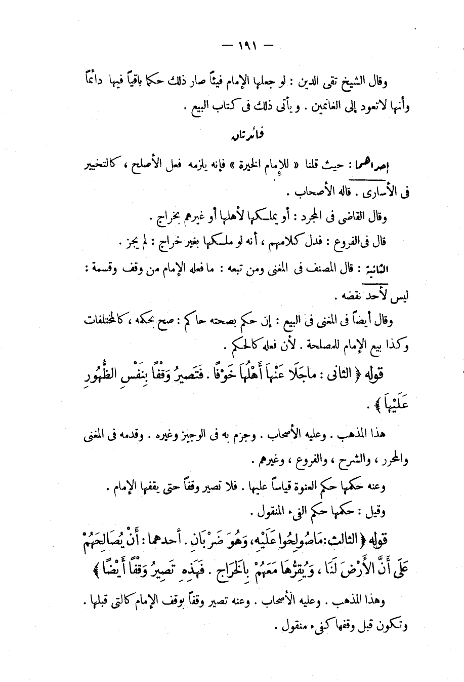 وَقَالَ الشَّيْخُ تَقِيُّ الدِّينِ: لَوْ جَعَلَهَا الْإِمَامُ فَيْئًا صَارَ ذَلِكَ حُكْمًا بَاقِيًا فِيهَا دَائِمًا وَأَنَّهَا لَا تَعُودُ إلَى الْغَانِمِينَ. وَيَأْتِي ذَلِكَ فِي كِتَابِ الْبَيْعِ. فَائِدَتَانِ