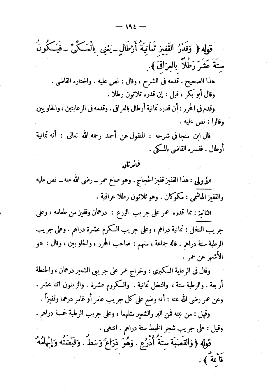 قَالَ ابْنُ مُنَجَّا فِي شَرْحِهِ: الْمَنْقُولُ عَنْ أَحْمَدَ - رَحِمَهُ اللَّهُ تَعَالَى -: أَنَّهُ ثَمَانِيَةُ أَرْطَالٍ. فَفَسَّرَهُ الْقَاضِي بِالْمَكِّيِّ. فَائِدَتَانِ