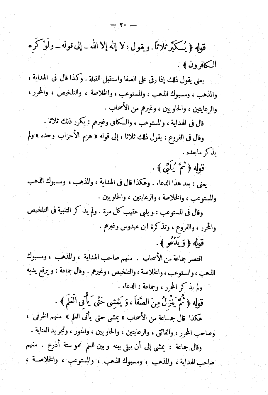 قَوْلُهُ (يُكَبِّرُ ثَلَاثًا وَيَقُولُ: لَا إلَهَ إلَّا اللَّهُ إلَى قَوْلِهِ وَلَوْ كَرِهَ الْكَافِرُونَ) يَعْنِي يَقُولُ ذَلِكَ إذَا رَقَى عَلَى الصَّفَا وَاسْتَقْبَلَ الْقِبْلَةَ وَكَذَا قَالَ فِي الْهِدَايَةِ، وَالْمُذْهَبِ، وَمَسْبُوكِ الذَّهَبِ، وَالْمُسْتَوْعِبِ، وَالْخُلَاصَةِ، وَالتَّلْخِيصِ، وَالْمُحَرَّرِ، وَالرِّعَايَتَيْنِ، وَالْحَاوِيَيْنِ، وَغَيْرِهِمْ مِنْ الْأَصْحَابِ قَالَ فِي الْهِدَايَةِ، وَالْمُسْتَوْعِبِ، وَالْكَافِي وَغَيْرِهِمْ: يُكَرِّرُ ذَلِكَ ثَلَاثًا وَقَالَ فِي الْفُرُوعِ: يَقُولُ ذَلِكَ ثَلَاثًا، إلَى قَوْلِهِ " هَزَمَ الْأَحْزَابَ وَحْدَهُ " وَلَمْ يَذْكُرْ مَا بَعْدَهُ.
