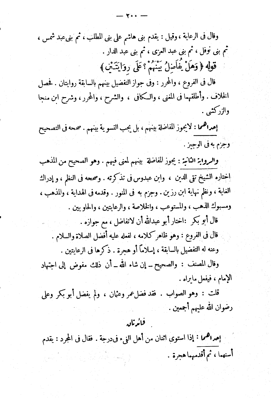 قَوْلُهُ (وَهَلْ يُفَاضَلُ بَيْنَهُمْ؟ عَلَى رِوَايَتَيْنِ) قَالَ فِي الْفُرُوعِ، وَالْمُحَرَّرِ: وَفِي جَوَازِ التَّفْضِيلِ بَيْنَهُمْ بِالسَّابِقَةِ رِوَايَتَانِ. فَحَصَلَ الْخِلَافُ. وَأَطْلَقَهُمَا فِي الْمُغْنِي، وَالْكَافِي، وَالشَّرْحِ، وَالْمُحَرَّرِ، وَشَرْحِ ابْنِ مُنَجَّا وَالزَّرْكَشِيِّ.
