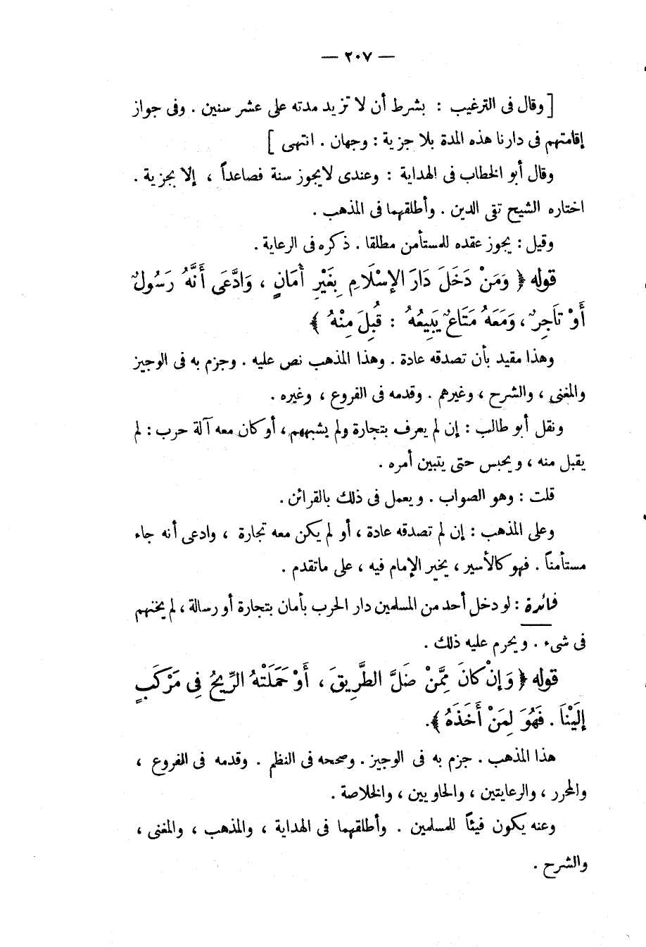 [وَقَالَ فِي التَّرْغِيبِ: بِشَرْطِ أَنْ لَا تَزِيدَ مُدَّتُهُ عَلَى عَشْرِ سِنِينَ. وَفِي جَوَازِ إقَامَتِهِمْ فِي دَارِنَا هَذِهِ الْمُدَّةَ بِلَا جِزْيَةٍ: وَجْهَانِ. انْتَهَى] وَقَالَ أَبُو الْخَطَّابِ فِي الْهِدَايَةِ: وَعِنْدِي لَا يَجُوزُ سَنَةً فَصَاعِدًا، إلَّا بِجِزْيَةٍ. اخْتَارَهُ الشَّيْخُ تَقِيُّ الدِّينِ. وَأَطْلَقَهُمَا فِي الْمُذْهَبِ. وَقِيلَ: يَجُوزُ عَقْدُهُ لِلْمُسْتَأْمَنِ مُطْلَقًا. وَذَكَرَهُ فِي الرِّعَايَةِ.