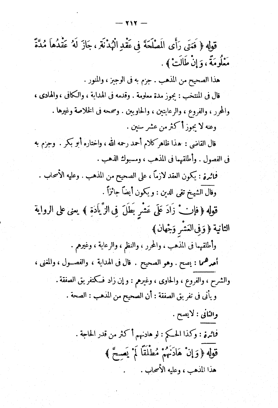 قَوْلُهُ (فَمَتَى رَأَى الْمَصْلَحَةَ فِي عَقْدِ الْهُدْنَةِ، جَازَ لَهُ عَقْدُهَا مُدَّةً مَعْلُومَةً، وَإِنْ طَالَتْ) . هَذَا الصَّحِيحُ مِنْ الْمَذْهَبِ. جَزَمَ بِهِ فِي الْوَجِيزِ، وَالْمُنَوِّرِ. قَالَ فِي الْمُنْتَخَبِ: يَجُوزُ مُدَّةً مَعْلُومَةً. وَقَدَّمَهُ فِي الْهِدَايَةِ، وَالْكَافِي، وَالْهَادِي، وَالْمُحَرَّرِ، وَالْفُرُوعِ، وَالرِّعَايَتَيْنِ، وَالْحَاوِيَيْنِ. وَصَحَّحَهُ فِي الْخُلَاصَةِ وَغَيْرِهَا. وَعَنْهُ لَا يَحُوزُ أَكْثَرُ مِنْ عَشْرِ سِنِينَ. قَالَ الْقَاضِي: هَذَا ظَاهِرُ كَلَامِ أَحْمَدَ - رَحِمَهُ اللَّهُ -، وَاخْتَارَهُ أَبُو بَكْرٍ. وَجَزَمَ بِهِ فِي الْفُصُولِ. وَأَطْلَقَهُمَا فِي الْمُذْهَبِ، وَمَسْبُوكِ الذَّهَبِ.