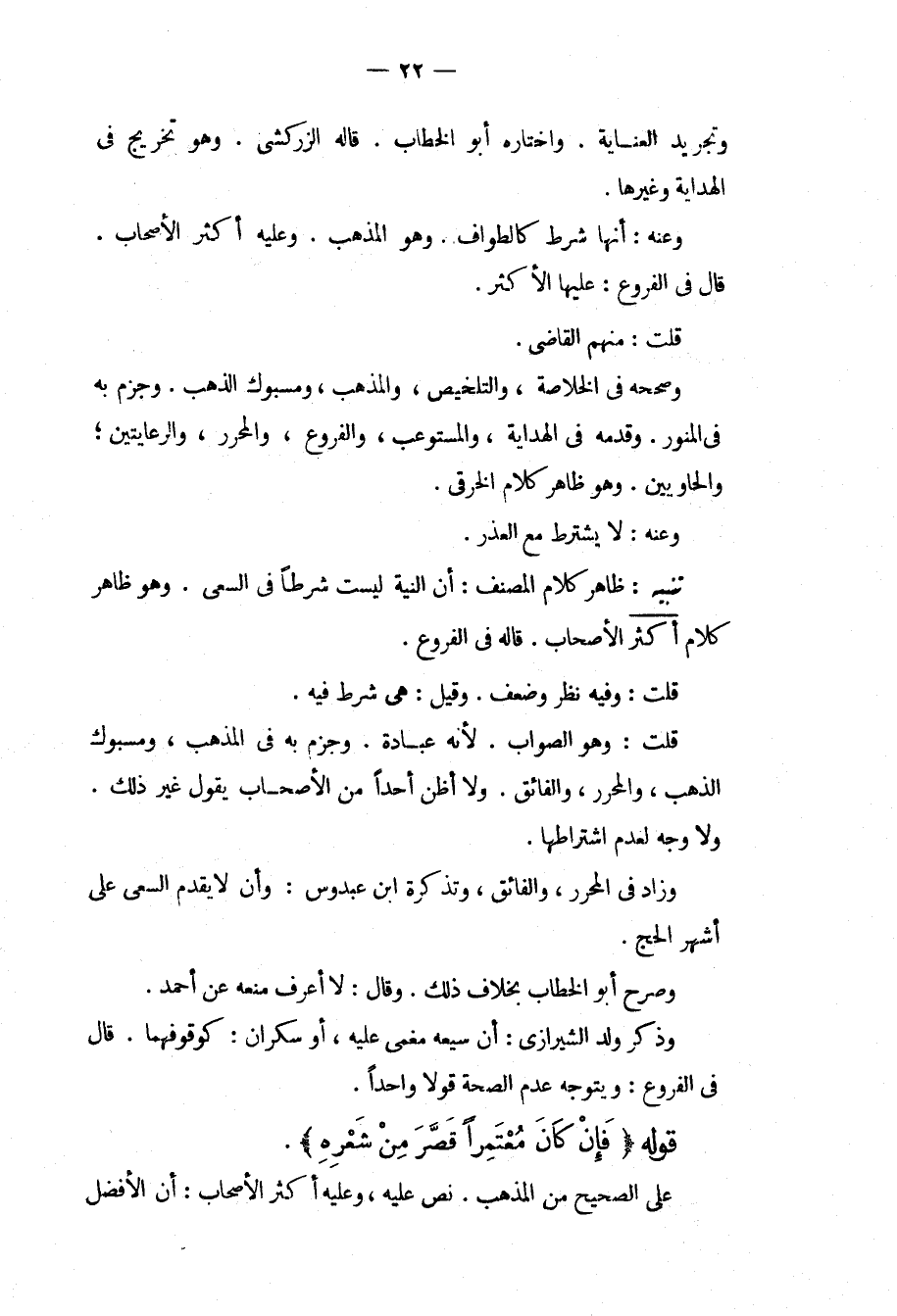 وَتَجْرِيدُ الْعِنَايَةِ وَاخْتَارَهُ أَبُو الْخَطَّابِ قَالَهُ الزَّرْكَشِيُّ وَهُوَ تَخْرِيجٌ فِي الْهِدَايَةِ وَغَيْرِهَا وَعَنْهُ: أَنَّهَا شَرْطٌ كَالطَّوَافِ وَهُوَ الْمَذْهَبُ وَعَلَيْهِ أَكْثَرُ الْأَصْحَابِ قَالَ فِي الْفُرُوعِ: عَلَيْهَا الْأَكْثَرُ قُلْت: مِنْهُمْ الْقَاضِي وَصَحَّحَهُ فِي الْخُلَاصَةِ، وَالتَّلْخِيصِ، وَالْمُذْهَبِ، وَمَسْبُوكِ الذَّهَبِ وَجَزَمَ بِهِ فِي الْمُنَوِّرِ وَقَدَّمَهُ فِي الْهِدَايَةِ، وَالْمُسْتَوْعِبِ، وَالْفُرُوعِ، وَالْمُحَرَّرِ، وَالرِّعَايَتَيْنِ، وَالْحَاوِيَيْنِ وَهُوَ ظَاهِرُ كَلَامِ الْخِرَقِيُّ وَعَنْهُ: لَا يُشْتَرَطُ مَعَ الْعُذْرِ