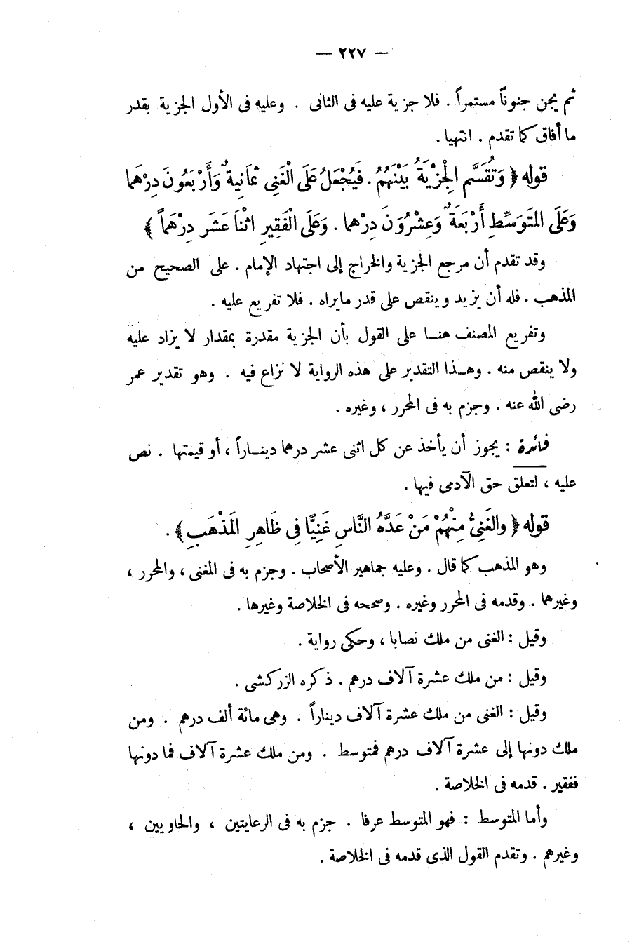 قَوْلُهُ (وَتُقْسَمُ الْجِزْيَةُ بَيْنَهُمْ فَيُجْعَلُ عَلَى الْغَنِيِّ ثَمَانِيَةٌ وَأَرْبَعُونَ دِرْهَمًا وَعَلَى الْمُتَوَسِّطِ أَرْبَعَةٌ وَعِشْرُونَ دِرْهَمًا. وَعَلَى الْفَقِيرِ اثْنَا عَشَرَ دِرْهَمًا) وَقَدْ تَقَدَّمَ أَنَّ مَرْجِعَ الْجِزْيَةِ وَالْخَرَاجِ إلَى اجْتِهَادِ الْإِمَامِ. عَلَى الصَّحِيحِ مِنْ الْمَذْهَبِ. فَلَهُ أَنْ يَزِيدَ وَيُنْقِصَ عَلَى قَدْرِ مَا يَرَاهُ. فَلَا تَفْرِيعَ عَلَيْهِ. وَتَفْرِيعُ الْمُصَنِّفِ هُنَا عَلَى الْقَوْلِ بِأَنَّ الْجِزْيَةَ مُقَدَّرَةٌ بِمِقْدَارٍ لَا يُزَادُ عَلَيْهِ وَلَا يَنْقُصُ مِنْهُ. وَهَذَا التَّقْدِيرُ عَلَى هَذِهِ الرِّوَايَةِ لَا نِزَاعَ فِيهِ. وَهُوَ تَقْدِيرُ عُمَرَ - رَضِيَ اللَّهُ عَنْهُ -. وَجَزَمَ بِهِ فِي الْمُحَرَّرِ، وَغَيْرِهِ.