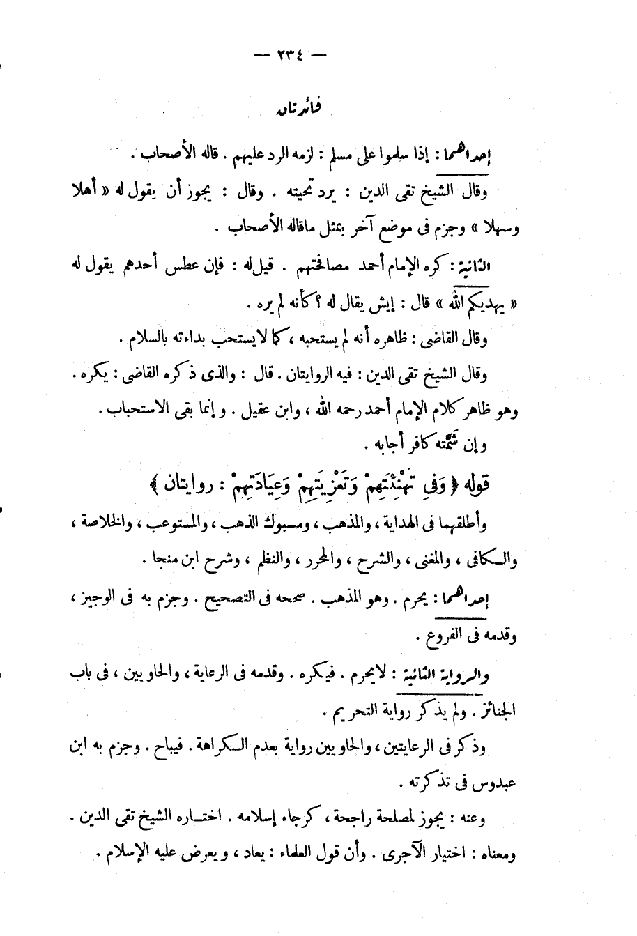 إحْدَاهُمَا: إذَا سَلَّمُوا عَلَى مُسْلِمٍ: لَزِمَهُ الرَّدُّ عَلَيْهِمْ. قَالَهُ الْأَصْحَابُ. وَقَالَ الشَّيْخُ تَقِيُّ الدِّينِ: يَرُدُّ تَحِيَّتَهُ. وَقَالَ: يَجُوزُ أَنْ يَقُولَ لَهُ " أَهْلًا وَسَهْلًا " وَجَزَمَ فِي مَوْضِعٍ آخَرَ بِمِثْلِ مَا قَالَهُ الْأَصْحَابُ.