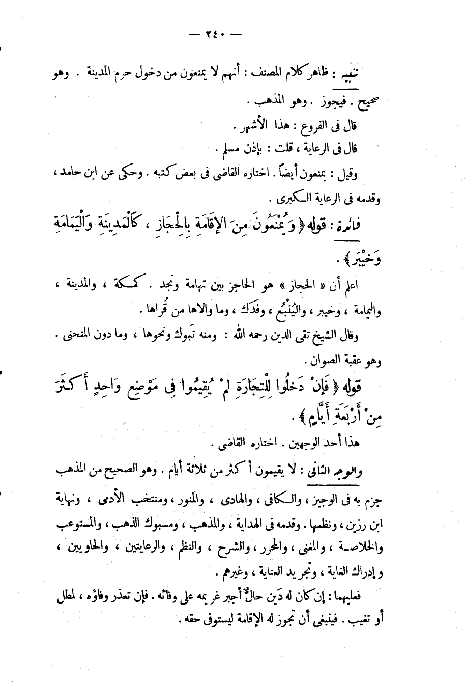 فَائِدَةٌ قَوْلُهُ (وَيُمْنَعُونَ مِنْ الْإِقَامَةِ بِالْحِجَازِ، كَالْمَدِينَةِ وَالْيَمَامَةِ وَخَيْبَرَ) . اعْلَمْ أَنَّ " الْحِجَازَ " هُوَ الْحَاجِزُ بَيْنَ تِهَامَةَ وَنَجْدٍ كَمَكَّةَ، وَالْمَدِينَةِ، وَالْيَمَامَةِ، وَخَيْبَرَ، وَالْيَنْبُعِ، وَفَدَكَ، وَمَا وَالَاهَا مِنْ قُرَاهَا. وَقَالَ الشَّيْخُ تَقِيُّ الدِّينِ - رَحِمَهُ اللَّهُ -: وَمِنْهُ تَبُوكُ وَنَحْوُهَا، وَمَا دُونَ الْمُنْحَنَى. وَهُوَ عَقَبَةُ الصَّوَّانِ.