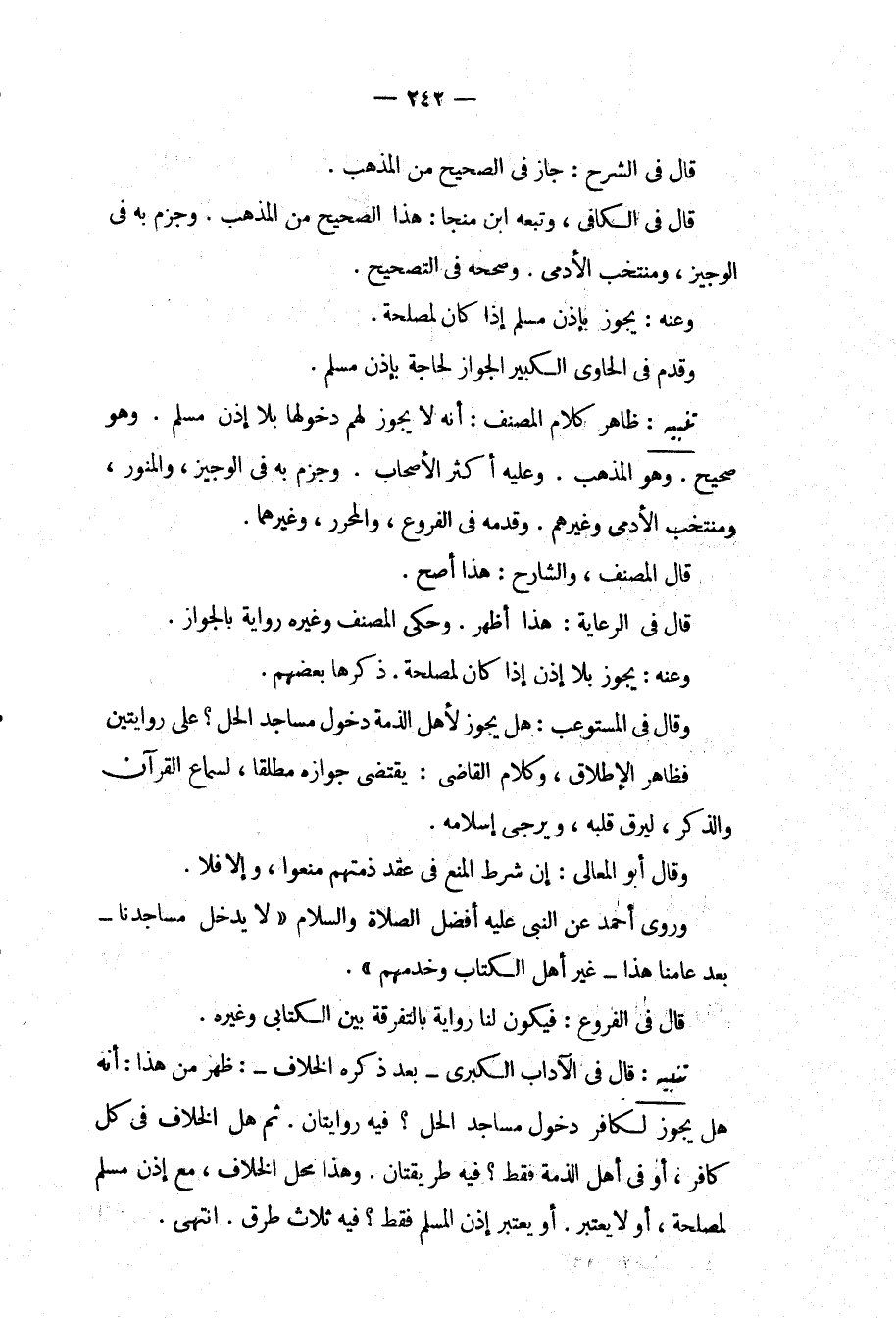 تَنْبِيهٌ قَالَ فِي الْآدَابِ الْكُبْرَى بَعْدَ ذِكْرِهِ الْخِلَافَ: ظَهَرَ مِنْ هَذَا: أَنَّهُ هَلْ يَجُوزُ لِكَافِرِ دُخُولُ مَسَاجِدِ الْحِلِّ؟ فِيهِ رِوَايَتَانِ. ثُمَّ هَلْ الْخِلَافُ فِي كُلِّ كَافِرٍ، أَوْ فِي أَهْلِ الذِّمَّةِ فَقَطْ؟ فِيهِ طَرِيقَتَانِ. وَهَذَا مَحَلُّ الْخِلَافِ، مَعَ إذْنِ مُسْلِمٍ لِمَصْلَحَةٍ، أَوْ لَا يُعْتَبَرُ. أَوْ يُعْتَبَرُ إذْنُ الْمُسْلِمِ فَقَطْ؟ فِيهِ ثَلَاثُ طُرُقٍ. انْتَهَى.
