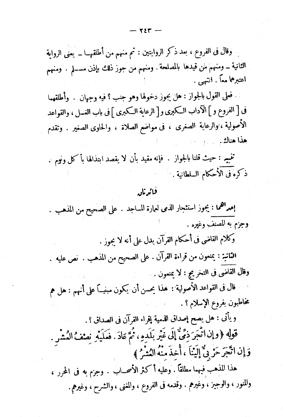 وَقَالَ فِي الْفُرُوعِ، بَعْدَ ذِكْرِ الرِّوَايَتَيْنِ: ثُمَّ مِنْهُمْ مَنْ أَطْلَقَهَا يَعْنِي الرِّوَايَةَ الثَّانِيَةَ وَمِنْهُمْ مَنْ قَيَّدَهَا بِالْمَصْلَحَةِ. وَمِنْهُمْ مَنْ جَوَّزَ ذَلِكَ بِإِذْنِ مُسْلِمٍ. وَمِنْهُمْ اعْتَبَرَهُمَا مَعًا. انْتَهَى. فَعَلَى الْقَوْلِ بِالْجَوَازِ: هَلْ يَجُوزُ دُخُولُهَا وَهُوَ جُنُبٌ؟ فِيهِ وَجْهَانِ. وَأَطْلَقَهُمَا فِي [الْفُرُوعِ] وَالْآدَابِ الْكُبْرَى [وَالرِّعَايَةِ الْكُبْرَى] فِي بَابِ الْغُسْلِ، وَالْقَوَاعِدِ الْأُصُولِيَّةِ، وَالرِّعَايَةِ الصُّغْرَى، فِي مَوَاضِعِ الصَّلَاةِ، وَالْحَاوِي الصَّغِيرِ. وَتَقَدَّمَ هَذَا هُنَاكَ.