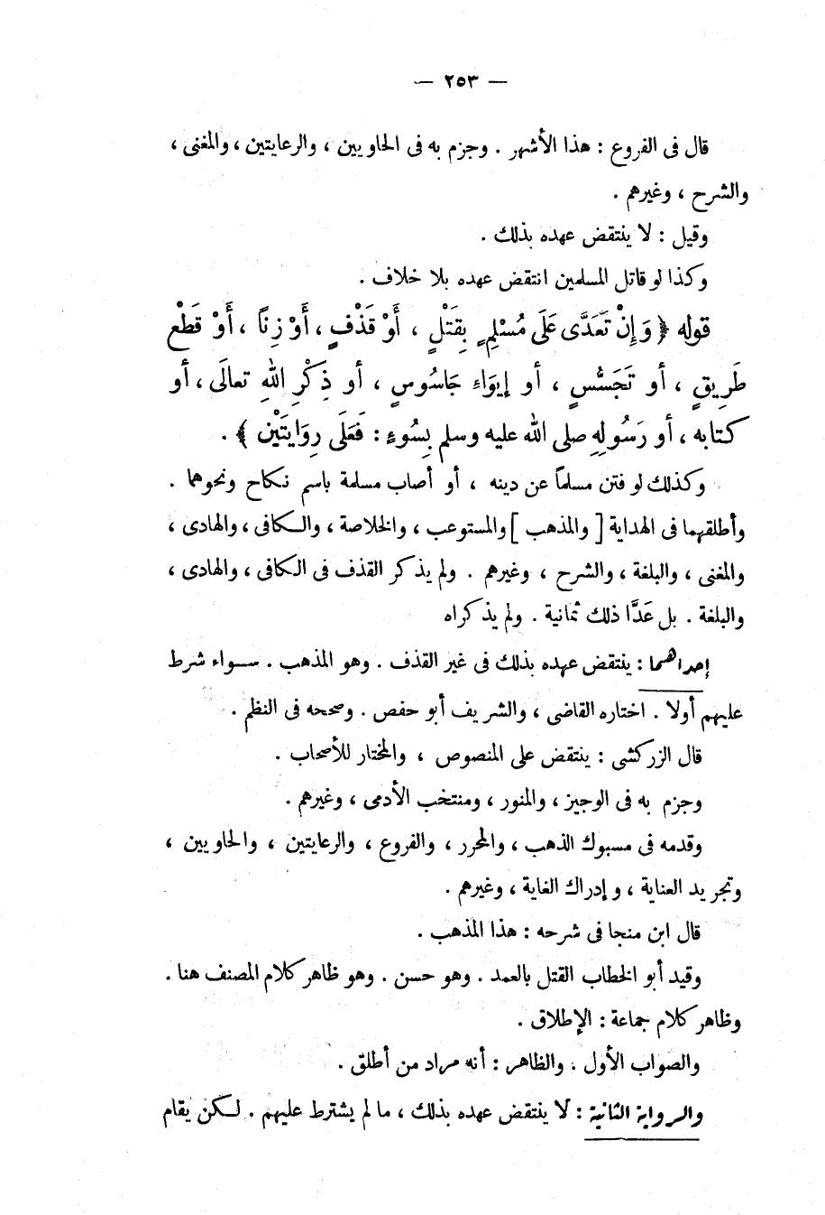 إحْدَاهُمَا: يُنْتَقَضُ عَهْدُهُ بِذَلِكَ فِي غَيْرِ الْقَذْفِ. وَهُوَ الْمَذْهَبُ. سَوَاءٌ شُرِطَ عَلَيْهِمْ أَوْ لَا. اخْتَارَهُ الْقَاضِي، وَالشَّرِيفُ أَبُو حَفْصٍ. وَصَحَّحَهُ فِي النَّظْمِ. قَالَ الزَّرْكَشِيُّ: يُنْتَقَضُ عَلَى الْمَنْصُوصِ، وَالْمُخْتَارُ لِلْأَصْحَابِ. وَجَزَمَ بِهِ فِي الْوَجِيزِ، وَالْمُنَوِّرِ، وَمُنْتَخَبِ الْأَدَمِيِّ، وَغَيْرِهِمْ. وَقَدَّمَهُ فِي مَسْبُوكِ الذَّهَبِ، وَالْمُحَرَّرِ، وَالْفُرُوعِ، وَالرِّعَايَتَيْنِ، وَالْحَاوِيَيْنِ، وَتَجْرِيدِ الْعِنَايَةِ، وَإِدْرَاكِ الْغَايَةِ، وَغَيْرِهِمْ. قَالَ ابْنُ مُنَجَّا فِي شَرْحِهِ: هَذَا الْمَذْهَبُ. وَقَيَّدَ أَبُو الْخَطَّابِ الْقَتْلَ بِالْعَمْدِ. وَهُوَ حَسَنٌ. وَهُوَ ظَاهِرُ كَلَامِ الْمُصَنِّفِ هُنَا. وَظَاهِرُ كَلَامِ جَمَاعَةٍ: الْإِطْلَاقُ.