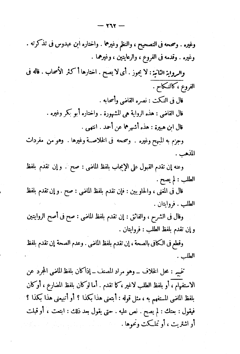وَالرِّوَايَةُ الثَّانِيَةُ: لَا يَجُوزُ. أَيْ لَا يَصِحُّ. اخْتَارَهَا أَكْثَرُ الْأَصْحَابِ. قَالَهُ فِي الْفُرُوعِ كَالنِّكَاحِ. قَالَ فِي النُّكَتِ: نَصَرَهُ الْقَاضِي وَأَصْحَابُهُ. قَالَ الْقَاضِي: هَذِهِ الرِّوَايَةُ هِيَ الْمَشْهُورَةُ. وَاخْتَارَهُ أَبُو بَكْرٍ وَغَيْرُهُ. قَالَ ابْنُ هُبَيْرَةَ: هَذِهِ أَشْهَرُهُمَا عَنْ أَحْمَدَ. انْتَهَى. وَجَزَمَ بِهِ الْمُبْهِجُ وَغَيْرُهُ. وَصَحَّحَهُ فِي الْخُلَاصَةِ وَغَيْرِهَا. وَهُوَ مِنْ مُفْرَدَاتِ الْمَذْهَبِ. وَعَنْهُ إنْ تَقَدَّمَ الْقَبُولُ عَلَى الْإِيجَابِ بِلَفْظِ الْمَاضِي: صَحَّ. وَإِنْ تَقَدَّمَ بِلَفْظِ الطَّلَبِ: لَمْ يَصِحَّ. قَالَ فِي الْمُغْنِي، وَالْحَاوِيَيْنِ: فَإِنْ تَقَدَّمَ بِلَفْظِ الْمَاضِي: صَحَّ. وَإِنْ تَقَدَّمَ بِلَفْظِ الطَّلَبِ. فَرِوَايَتَانِ. وَقَالَ فِي الشَّرْحِ، وَالْفَائِقِ: إنْ تَقَدَّمَ بِلَفْظِ الْمَاضِي: صَحَّ فِي أَصَحِّ الرِّوَايَتَيْنِ وَإِنْ تَقَدَّمَ بِلَفْظِ الطَّلَبِ: فَرِوَايَتَانِ. وَقَطَعَ فِي الْكَافِي بِالصِّحَّةِ، إنْ تَقَدَّمَ بِلَفْظِ الْمَاضِي. وَعَدَمُ الصِّحَّةِ إنْ تَقَدَّمَ بِلَفْظِ الطَّلَبِ.