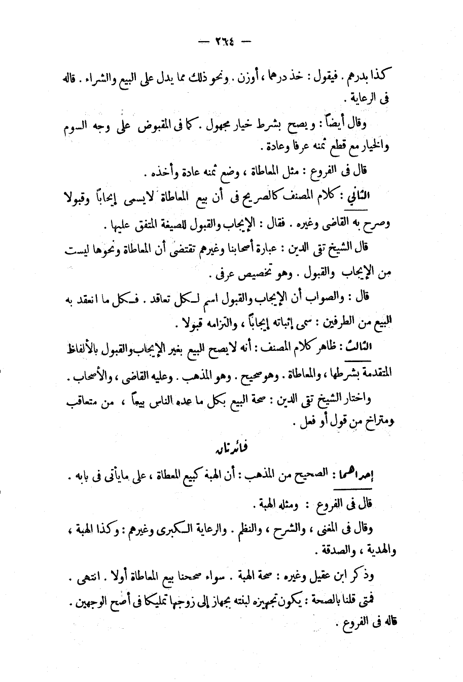 الثَّانِي: كَلَامُ الْمُصَنِّفِ كَالصَّرِيحِ فِي أَنَّ بَيْعَ الْمُعَاطَاةِ لَا يُسَمَّى إيجَابًا وَقَبُولًا وَصَرَّحَ بِهِ الْقَاضِي وَغَيْرُهُ. فَقَالَ: الْإِيجَابُ وَالْقَبُولُ لِلصِّيغَةِ الْمُتَّفَقِ عَلَيْهَا. قَالَ الشَّيْخُ تَقِيُّ الدِّينِ: عِبَارَةُ أَصْحَابِنَا وَغَيْرِهِمْ تَقْتَضِي أَنَّ الْمُعَاطَاةَ وَنَحْوَهَا لَيْسَتْ مِنْ الْإِيجَابِ وَالْقَبُولِ. وَهُوَ تَخْصِيصٌ عُرْفِيٌّ. قَالَ: وَالصَّوَابُ أَنَّ الْإِيجَابَ وَالْقَبُولَ اسْمُ كُلِّ تَعَاقُدٍ. فَكُلُّ مَا انْعَقَدَ بِهِ الْبَيْعُ مِنْ الطَّرَفَيْنِ: سُمِّيَ إثْبَاتُهُ إيجَابًا، وَالْتِزَامُهُ قَبُولًا.