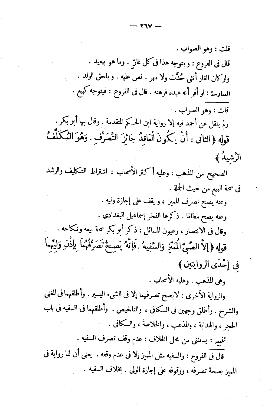 (الثَّانِي: أَنْ يَكُونَ الْعَاقِدُ جَائِزَ التَّصَرُّفِ وَهُوَ الْمُكَلَّفُ الرَّشِيدُ) الصَّحِيحُ مِنْ الْمَذْهَبِ، وَعَلَيْهِ أَكْثَرُ الْأَصْحَابِ: اشْتِرَاطُ التَّكْلِيفِ وَالرُّشْدِ فِي صِحَّةِ الْبَيْعِ مِنْ حَيْثُ الْجُمْلَةُ. وَعَنْهُ يَصِحُّ تَصَرُّفُ الْمُمَيِّزِ، وَيَقِفُ عَلَى إجَازَةِ وَلِيِّهِ. وَعَنْهُ يَصِحُّ مُطْلَقًا. ذَكَرَهَا الْفَخْرُ إسْمَاعِيلُ الْبَغْدَادِيُّ. وَقَالَ فِي الِانْتِصَارِ، وَعُيُونِ الْمَسَائِلِ: ذَكَرَ أَبُو بَكْرٍ صِحَّةَ بَيْعِهِ وَنِكَاحِهِ. قَوْلُهُ (إلَّا الصَّبِيَّ الْمُمَيِّزَ وَالسَّفِيهَ. فَإِنَّهُ يَصِحُّ تَصَرُّفُهُمَا بِإِذْنِ وَلِيِّهِمَا فِي إحْدَى الرِّوَايَتَيْنِ) وَهِيَ الْمَذْهَبُ. وَعَلَيْهِ الْأَصْحَابُ.