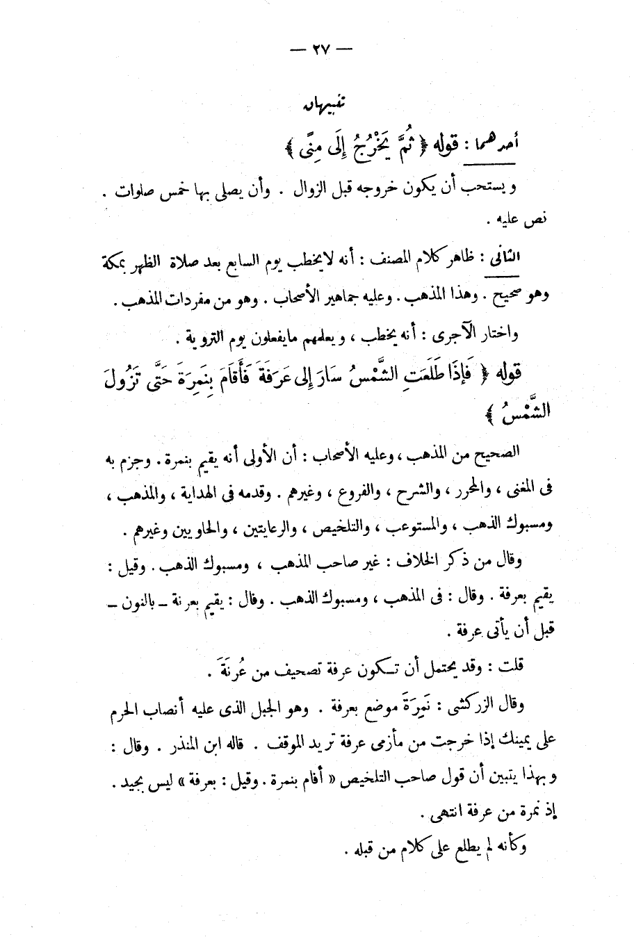 الثَّانِي: ظَاهِرُ كَلَامِ الْمُصَنِّفِ: أَنَّهُ لَا يَخْطُبُ يَوْمَ السَّابِعِ بَعْدَ صَلَاةِ الظُّهْرِ بِمَكَّةَ وَهُوَ صَحِيحٌ وَهَذَا الْمَذْهَبُ وَعَلَيْهِ جَمَاهِيرُ الْأَصْحَابِ وَهُوَ مِنْ مُفْرَدَاتِ الْمَذْهَبِ وَاخْتَارَ الْآجُرِّيُّ: أَنَّهُ يَخْطُبُ، وَيُعْلِمُهُمْ مَا يَفْعَلُونَ يَوْمَ التَّرْوِيَةِ.