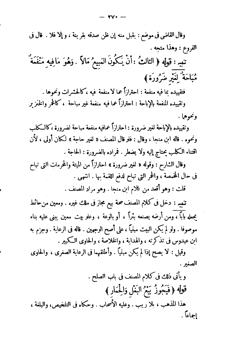 تَنْبِيهٌ قَوْلُهُ (الثَّالِثُ: أَنْ يَكُونَ الْمَبِيعُ مَالًا. وَهُوَ مَا فِيهِ مَنْفَعَةٌ مُبَاحَةٌ لِغَيْرِ ضَرُورَةٍ) فَتَقْيِيدُهُ بِمَا فِيهِ مَنْفَعَةٌ: احْتِرَازًا عَمَّا لَا مَنْفَعَةَ فِيهِ، كَالْحَشَرَاتِ وَنَحْوِهَا. وَتَقْيِيدُهُ الْمَنْفَعَةَ بِالْإِبَاحَةِ: احْتِرَازًا عَمَّا فِيهِ مَنْفَعَةٌ غَيْرُ مُبَاحَةٍ، كَالْخَمْرِ وَالْخِنْزِيرِ وَنَحْوِهِمَا. وَتَقْيِيدُهُ بِالْإِبَاحَةِ لِغَيْرِ ضَرُورَةٍ: احْتِرَازًا عَمَّا فِيهِ مَنْفَعَةٌ مُبَاحَةٌ لِضَرُورَةٍ، كَالْكَلْبِ وَنَحْوِهِ. قَالَهُ ابْنُ مُنَجَّا، وَقَالَ: فَلَوْ قَالَ الْمُصَنِّفُ " لِغَيْرِ حَاجَةٍ " لَكَانَ أَوْلَى، لِأَنَّ اقْتِنَاءَ الْكَلْبِ يُحْتَاجُ إلَيْهِ وَلَا يَضْطَرُّ. فَمُرَادُهُ بِالضَّرُورَةِ: الْحَاجَةُ. وَقَالَ الشَّارِحُ: وَقَوْلُهُ " لِغَيْرِ ضَرُورَةٍ " احْتِرَازًا مِنْ الْمَيْتَةِ وَالْمُحَرَّمَاتِ الَّتِي تُبَاحُ فِي حَالِ الْمَخْمَصَةِ، وَالْخَمْرِ الَّتِي تُبَاحُ لِدَفْعِ اللُّقْمَةِ بِهَا. انْتَهَى. قُلْت: وَهُوَ أَقْعَدُ مِنْ كَلَامِ ابْنِ مُنَجَّا. وَهُوَ مُرَادُ الْمُصَنِّفِ.
