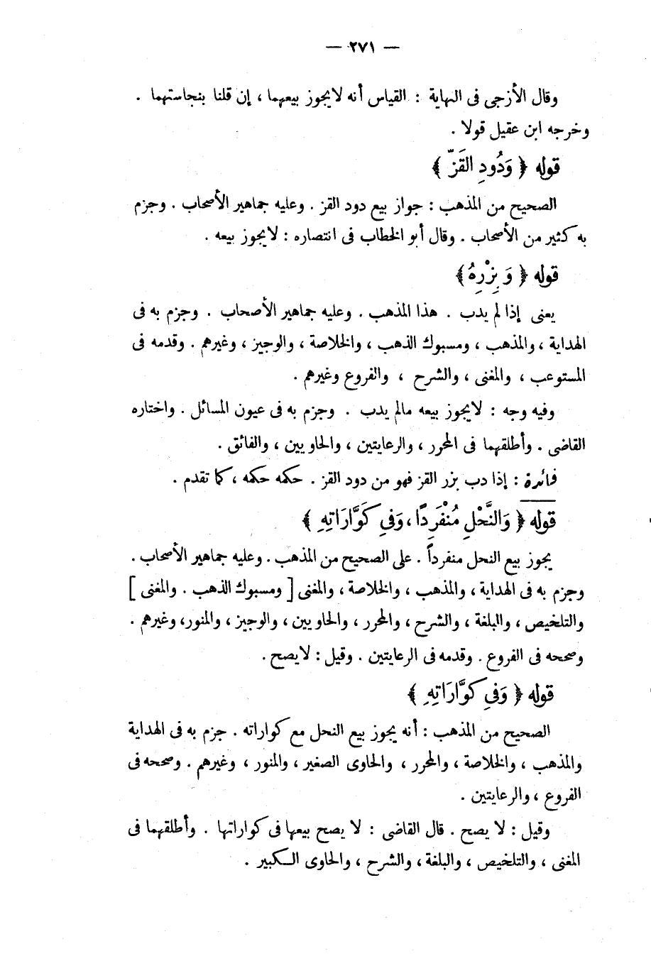 قَوْلُهُ (وَالنَّحْلِ مُنْفَرِدًا، وَفِي كُوَّارَاتِهِ) يَجُوزُ بَيْعُ النَّحْلِ مُنْفَرِدًا. عَلَى الصَّحِيحِ مِنْ الْمَذْهَبِ. وَعَلَيْهِ جَمَاهِيرُ الْأَصْحَابِ. وَجَزَمَ بِهِ فِي الْهِدَايَةِ، وَالْمُذْهَبِ، وَالْخُلَاصَةِ، وَالْمُغْنِي [وَمَسْبُوكِ الذَّهَبِ. وَالْمُغْنِي] وَالتَّلْخِيصِ، وَالْبُلْغَةِ، وَالشَّرْحِ، وَالْمُحَرَّرِ، وَالْحَاوِيَيْنِ، وَالْوَجِيزِ، وَالْمُنَوِّرِ، وَغَيْرِهِمْ. وَصَحَّحَهُ فِي الْفُرُوعِ. وَقَدَّمَهُ فِي الرِّعَايَتَيْنِ. وَقِيلَ: لَا يَصِحُّ. قَوْلُهُ (وَفِي كُوَّارَاتِهِ) الصَّحِيحُ مِنْ الْمَذْهَبِ: أَنَّهُ يَجُوزُ بَيْعُ النَّحْلِ مَعَ كُوَّارَاتِهِ. جَزَمَ بِهِ فِي الْهِدَايَةِ وَالْمُذْهَبِ، وَالْخُلَاصَةِ، وَالْمُحَرَّرِ، وَالْحَاوِي الصَّغِيرِ، وَالْمُنَوِّرِ، وَغَيْرِهِمْ. وَصَحَّحَهُ فِي الْفُرُوعِ، وَالرِّعَايَتَيْنِ. وَقِيلَ: لَا يَصِحُّ. قَالَ الْقَاضِي: لَا يَصِحُّ بَيْعُهَا فِي كُوَّارَاتِهَا. وَأَطْلَقَهُمَا فِي الْمُغْنِي، وَالتَّلْخِيصِ، وَالْبُلْغَةِ، وَالشَّرْحِ، وَالْحَاوِي الْكَبِيرِ.