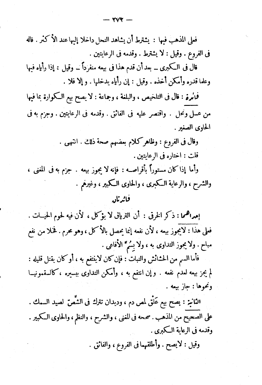 قَالَ فِي التَّلْخِيصِ، وَالْبُلْغَةِ، وَجَمَاعَةٌ: لَا يَصِحُّ بَيْعُ الْكُوَّارَةِ بِمَا فِيهَا مِنْ عَسَلٍ وَنَحْلٍ. وَاقْتَصَرَ عَلَيْهِ فِي الْفَائِقِ. وَقَدَّمَهُ فِي الرِّعَايَتَيْنِ. وَجَزَمَ بِهِ فِي الْحَاوِي الصَّغِيرِ. وَقَالَ فِي الْفُرُوعِ: وَظَاهِرُ كَلَامِ بَعْضِهِمْ صِحَّةُ ذَلِكَ. انْتَهَى. قُلْت: اخْتَارَهُ فِي الرِّعَايَتَيْنِ. وَأَمَّا إذَا كَانَ مَسْتُورًا بِأَقْرَاصِهِ: فَإِنَّهُ لَا يَجُوزُ بَيْعُهُ. جَزَمَ بِهِ فِي الْمُغْنِي، وَالشَّرْحِ، وَالرِّعَايَةِ الْكُبْرَى، وَالْحَاوِي الْكَبِيرِ، وَغَيْرِهِمْ. فَائِدَتَانِ إحْدَاهُمَا: ذَكَرَ الْخِرَقِيُّ. أَنَّ التِّرْيَاقَ لَا يُؤْكَلُ، لِأَنَّ فِيهِ لُحُومَ الْحَيَّاتِ. فَعَلَى هَذَا: لَا يَجُوزُ بَيْعُهُ، لِأَنَّ نَفْعَهُ إنَّمَا يَحْصُلُ بِالْأَكْلِ، وَهُوَ مُحَرَّمٌ. فَخَلَا مِنْ نَفْعٍ مُبَاحٍ. وَلَا يَجُوزُ التَّدَاوِي بِهِ، وَلَا بِسُمِّ الْأَفَاعِي. فَأَمَّا السُّمُّ مِنْ الْحَشَائِشِ وَالنَّبَاتِ: فَإِنْ كَانَ لَا يُنْتَفَعُ بِهِ، أَوْ كَانَ يَقْتُلُ قَلِيلُهُ: لَمْ يَجُزْ بَيْعُهُ لِعَدَمِ نَفْعِهِ. وَإِنْ انْتَفَعَ بِهِ، وَأَمْكَنَ التَّدَاوِي بِيَسِيرِهِ، كَالسَّقَمُونْيَا وَنَحْوِهَا: جَازَ بَيْعُهُ.