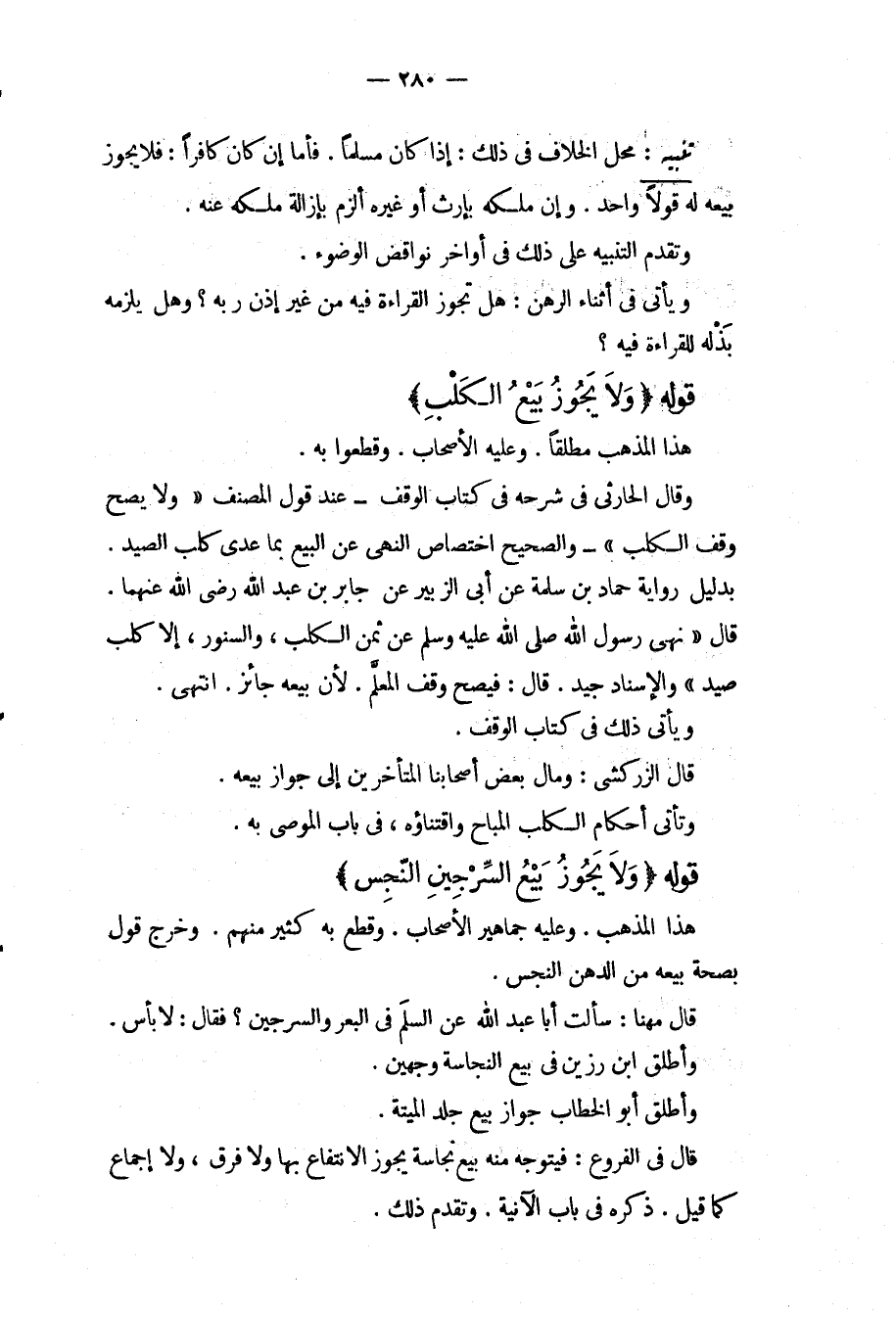 قَوْلُهُ (وَلَا يَجُوزُ بَيْعُ الْكَلْبِ) هَذَا الْمَذْهَبُ مُطْلَقًا. وَعَلَيْهِ الْأَصْحَابُ. وَقَطَعُوا بِهِ. وَقَالَ الْحَارِثِيُّ فِي شَرْحِهِ فِي كِتَابِ الْوَقْفِ عِنْدَ قَوْلِ الْمُصَنِّفِ " وَلَا يَصِحُّ وَقْفُ الْكَلْبِ " وَالصَّحِيحُ اخْتِصَاصُ النَّهْيِ عَنْ الْبَيْعِ بِمَا عَدَى كَلْبَ الصَّيْدِ. بِدَلِيلِ رِوَايَةِ حَمَّادِ بْنِ سَلَمَةَ عَنْ أَبِي الزُّبَيْرِ عَنْ جَابِرِ بْنِ عَبْدِ اللَّهِ - رَضِيَ اللَّهُ عَنْهُمَا -. قَالَ «نَهَى رَسُولُ اللَّهِ - صَلَّى اللَّهُ عَلَيْهِ وَسَلَّمَ - عَنْ ثَمَنِ الْكَلْبِ، وَالسِّنَّوْرِ، إلَّا كَلْبَ صَيْدٍ» وَالْإِسْنَادُ جَيِّدٌ. قَالَ: فَيَصِحُّ وَقْفُ الْمُعَلَّمِ. لِأَنَّ بَيْعَهُ جَائِزٌ. انْتَهَى. وَيَأْتِي ذَلِكَ فِي كِتَابِ الْوَقْفِ. قَالَ الزَّرْكَشِيُّ: وَمَالَ بَعْضُ أَصْحَابِنَا الْمُتَأَخِّرِينَ إلَى جَوَازِ بَيْعِهِ. وَتَأْتِي أَحْكَامُ الْكَلْبِ الْمُبَاحِ وَاقْتِنَاؤُهُ، فِي بَابِ الْمُوصَى بِهِ.