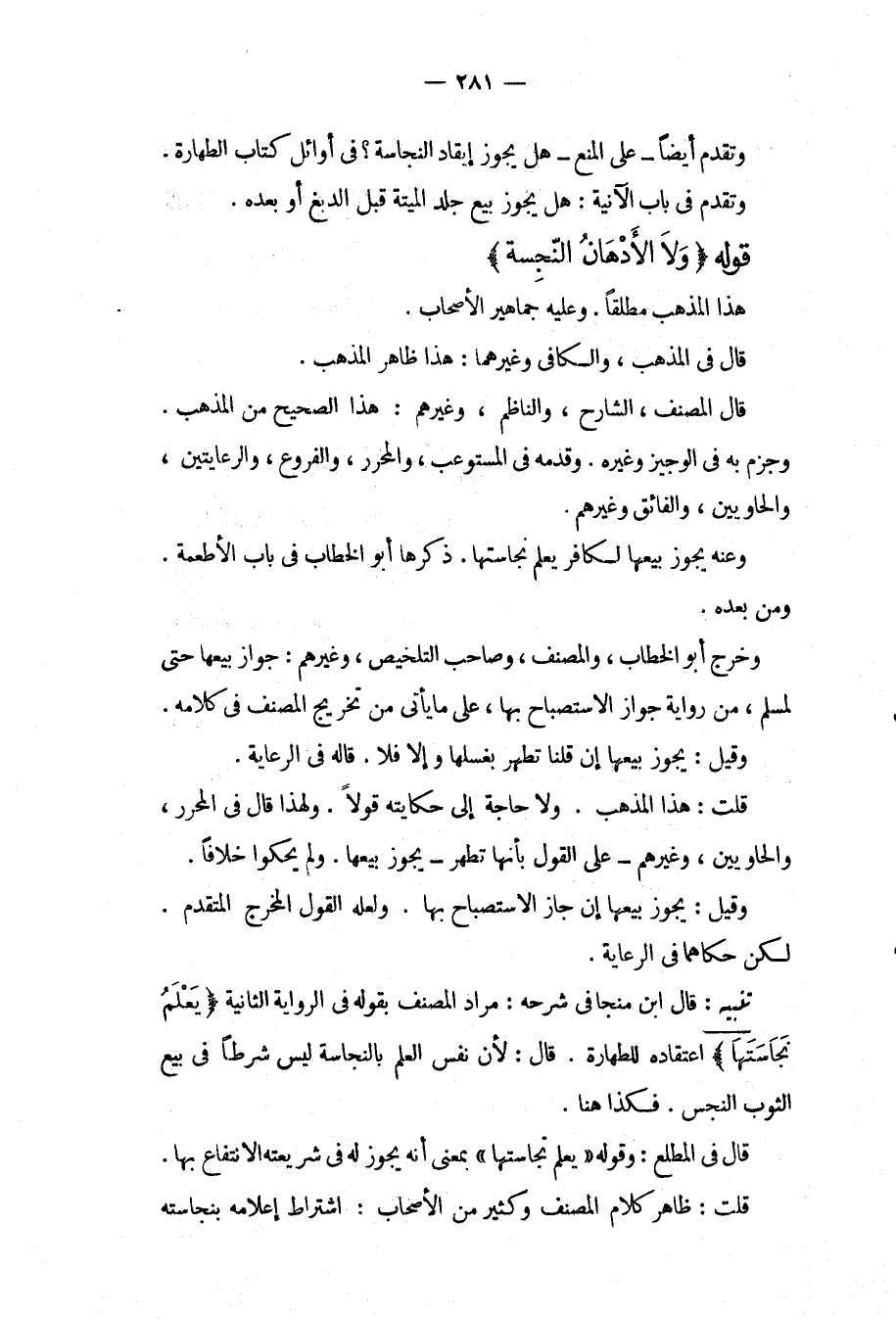 قَوْلُهُ (وَلَا الْأَدْهَانُ النَّجِسَةُ) هَذَا الْمَذْهَبُ مُطْلَقًا. وَعَلَيْهِ جَمَاهِيرُ الْأَصْحَابِ. قَالَ فِي الْمُذْهَبِ، وَالْكَافِي وَغَيْرِهِمَا: هَذَا ظَاهِرُ الْمَذْهَبِ. قَالَ الْمُصَنِّفُ، الشَّارِحُ، وَالنَّاظِمُ، وَغَيْرُهُمْ: هَذَا الصَّحِيحُ مِنْ الْمَذْهَبِ. وَجَزَمَ بِهِ فِي الْوَجِيزِ وَغَيْرِهِ. وَقَدَّمَهُ فِي الْمُسْتَوْعِبِ، وَالْمُحَرَّرِ، وَالْفُرُوعِ، وَالرِّعَايَتَيْنِ. وَالْحَاوِيَيْنِ، وَالْفَائِقِ وَغَيْرِهِمْ. وَعَنْهُ يَجُوزُ بَيْعُهَا لِكَافِرٍ عَلِمَ نَجَاسَتَهَا. ذَكَرَهَا أَبُو الْخَطَّابِ فِي بَابِ الْأَطْعِمَةِ. وَمَنْ بَعْدَهُ. وَخَرَّجَ أَبُو الْخَطَّابِ، وَالْمُصَنِّفُ، وَصَاحِبُ التَّلْخِيصِ، وَغَيْرُهُمْ: جَوَازَ بَيْعِهَا حَتَّى لِمُسْلِمٍ، مِنْ رِوَايَةِ جَوَازِ الِاسْتِصْبَاحِ بِهَا، عَلَى مَا يَأْتِي مِنْ تَخْرِيجِ الْمُصَنِّفِ فِي كَلَامِهِ. وَقِيلَ: يَجُوزُ بَيْعُهَا إنْ قُلْنَا تَطْهُرُ بِغَسْلِهَا وَإِلَّا فَلَا. قَالَهُ فِي الرِّعَايَةِ. قُلْت: هَذَا الْمَذْهَبُ. وَلَا حَاجَةَ إلَى حِكَايَتِهِ قَوْلًا. وَلِهَذَا قَالَ فِي الْمُحَرَّرِ، وَالْحَاوِيَيْنِ، وَغَيْرِهِمْ عَلَى الْقَوْلِ بِأَنَّهَا تَطْهُرُ يَجُوزُ بَيْعُهَا. وَلَمْ يَحْكُوا خِلَافًا. وَقِيلَ: يَجُوزُ بَيْعُهَا إنْ جَازَ الِاسْتِصْبَاحُ بِهَا. وَلَعَلَّهُ الْقَوْلُ الْمُخَرَّجُ الْمُتَقَدِّمُ. لَكِنْ حَكَاهُمَا فِي الرِّعَايَةِ.