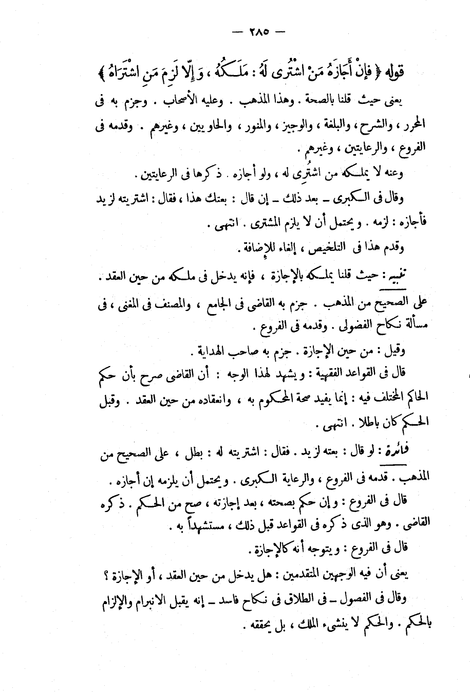 حَيْثُ قُلْنَا يَمْلِكُهُ بِالْإِجَازَةِ، فَإِنَّهُ يَدْخُلُ فِي مِلْكِهِ مِنْ حِينِ الْعَقْدِ. عَلَى الصَّحِيحِ مِنْ الْمَذْهَبِ. جَزَمَ بِهِ الْقَاضِي فِي الْجَامِعِ، وَالْمُصَنِّفُ فِي الْمُغْنِي، فِي مَسْأَلَةِ نِكَاحِ الْفُضُولِيِّ. وَقَدَّمَهُ فِي الْفُرُوعِ. وَقِيلَ: مِنْ حِينِ الْإِجَازَةِ. جَزَمَ بِهِ صَاحِبُ الْهِدَايَةِ. قَالَ فِي الْقَوَاعِدِ الْفِقْهِيَّةِ: وَيَشْهَدُ لِهَذَا الْوَجْهِ: أَنَّ الْقَاضِيَ صَرَّحَ بِأَنَّ حُكْمَ الْحَاكِمِ الْمُخْتَلَفَ فِيهِ: إنَّمَا يُفِيدُ صِحَّةَ الْمَحْكُومِ بِهِ، وَانْعِقَادُهُ مِنْ حِينِ الْعَقْدِ. وَقَبْلَ الْحُكْمِ كَانَ بَاطِلًا. انْتَهَى.