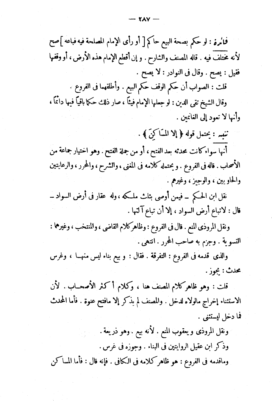 يَحْتَمِلُ قَوْلُهُ (إلَّا الْمَسَاكِنَ) . أَنَّهَا سَوَاءٌ كَانَتْ مُحْدَثَةً بَعْدَ الْفَتْحِ، أَوْ مِنْ جُمْلَةِ الْفَتْحِ. وَهُوَ اخْتِيَارُ جَمَاعَةٍ مِنْ الْأَصْحَابِ. قَالَهُ فِي الْفُرُوعِ. وَيَحْتَمِلُهُ كَلَامُهُ فِي الْمُغْنِي، وَالشَّرْحِ، وَالْمُحَرَّرِ، وَالرِّعَايَتَيْنِ وَالْحَاوِيَيْنِ، وَالْوَجِيزِ، وَغَيْرِهِمْ. نَقَلَ ابْنُ الْحَكَمِ فِيمَنْ أَوْصَى بِثُلُثِ مِلْكِهِ، وَلَهُ عَقَارٌ فِي أَرْضِ السَّوَادِ قَالَ: لَا تُبَاعُ أَرْضُ السَّوَادِ، إلَّا أَنْ تُبَاعَ آلَتُهَا. وَنَقَلَ الْمَرُّوذِيُّ الْمَنْعَ. قَالَ فِي الْفُرُوعِ: وَظَاهِرُ كَلَامِ الْقَاضِي، وَالْمُنْتَخَبِ، وَغَيْرِهِمَا: التَّسْوِيَةُ. وَجَزَمَ بِهِ صَاحِبُ الْمُحَرَّرِ. انْتَهَى. وَاَلَّذِي قَدَّمَهُ فِي الْفُرُوعِ: التَّفْرِقَةُ. فَقَالَ: وَبَيْعُ بِنَاءٍ لَيْسَ مِنْهَا، وَغَرْسٌ مُحْدَثٌ: يَجُوزُ. قُلْت: وَهُوَ ظَاهِرُ كَلَامِ الْمُصَنِّفِ هُنَا، وَكَلَامِ أَكْثَرِ الْأَصْحَابِ. لِأَنَّ الِاسْتِثْنَاءَ إخْرَاجُ مَا لَوْلَاهُ لَدَخَلَ. وَالْمُصَنِّفُ لَمْ يَذْكُرْ إلَّا مَا فُتِحَ عَنْوَةً. فَأَمَّا الْمُحْدَثُ فَمَا دَخَلَ لِيُسْتَثْنَى. وَنَقَلَ الْمَرُّوذِيُّ وَيَعْقُوبُ الْمَنْعَ. لِأَنَّهُ بَيْعٌ. وَهُوَ ذَرِيعَةٌ. وَذَكَرَ ابْنُ عَقِيلٍ الرِّوَايَتَيْنِ فِي الْبِنَاءِ. وَجَوَّزَهُ فِي غَرْسٍ. وَمَا قَدَّمَهُ فِي الْفُرُوعِ: هُوَ ظَاهِرُ كَلَامِهِ فِي الْكَافِي. فَإِنَّهُ قَالَ: فَأَمَّا الْمَسَاكِنُ